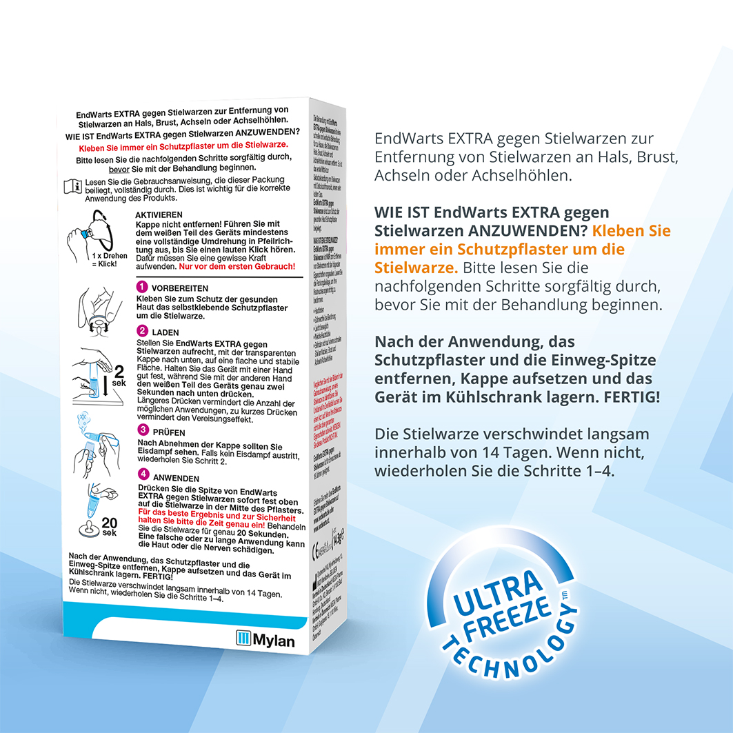 EndWarts Extra gegen Stielwarzen ist ein effektives Mittel zur Selbstbehandlung von Stielwarzen an Hals, Brust, Achsel und Achselhöhle. Es ist das erste Mittel zur Selbstbehandlung von Stielwarzen mit Distickstoffmonoxid, einem Gas, das nach der Aktivierung des Geräts sehr kalt ist. Durch seine Ultra Freeze Technology wird eine Temperatur von etwa -80°C erreicht und die Stielwarze wirksam vereist. EndWarts Extra gegen Stielwarzen ist ein innovatives Produkt, das schnell und einfach anzuwenden ist. Mit seiner Präzisionsspitze und dem schützenden Schaumstoffpflaster ist die Vereisung mit EndWarts Extra gegen Stielwarzen einfach. Die umliegende Haut bleibt unbeeinträchtigt. Die Behandlung ist für Erwachsene über 18 Jahre geeignet.