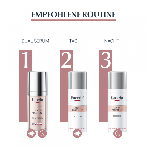 Das Eucerin Anti-Pigment Dual Serum mit dem Einkammer-Spender wirkt mit patentiertem Thiamidol®, das Pigmentflecken und sogenannte Altersflecken am Ursprung bekämpft, diese nach und nach mildert sowie bei regelmäßiger Anwendung verhindert, dass neue Pigmentflecken entstehen. Zusätzlich enthält die Gesichtspflege Hyaluronsäure, die der Haut intensive Feuchtigkeit spendet. Beide Texturen sind leicht und ziehen schnell ein – für ein strahlenderes Aussehen und einen ebenmäßigeren Hautton.