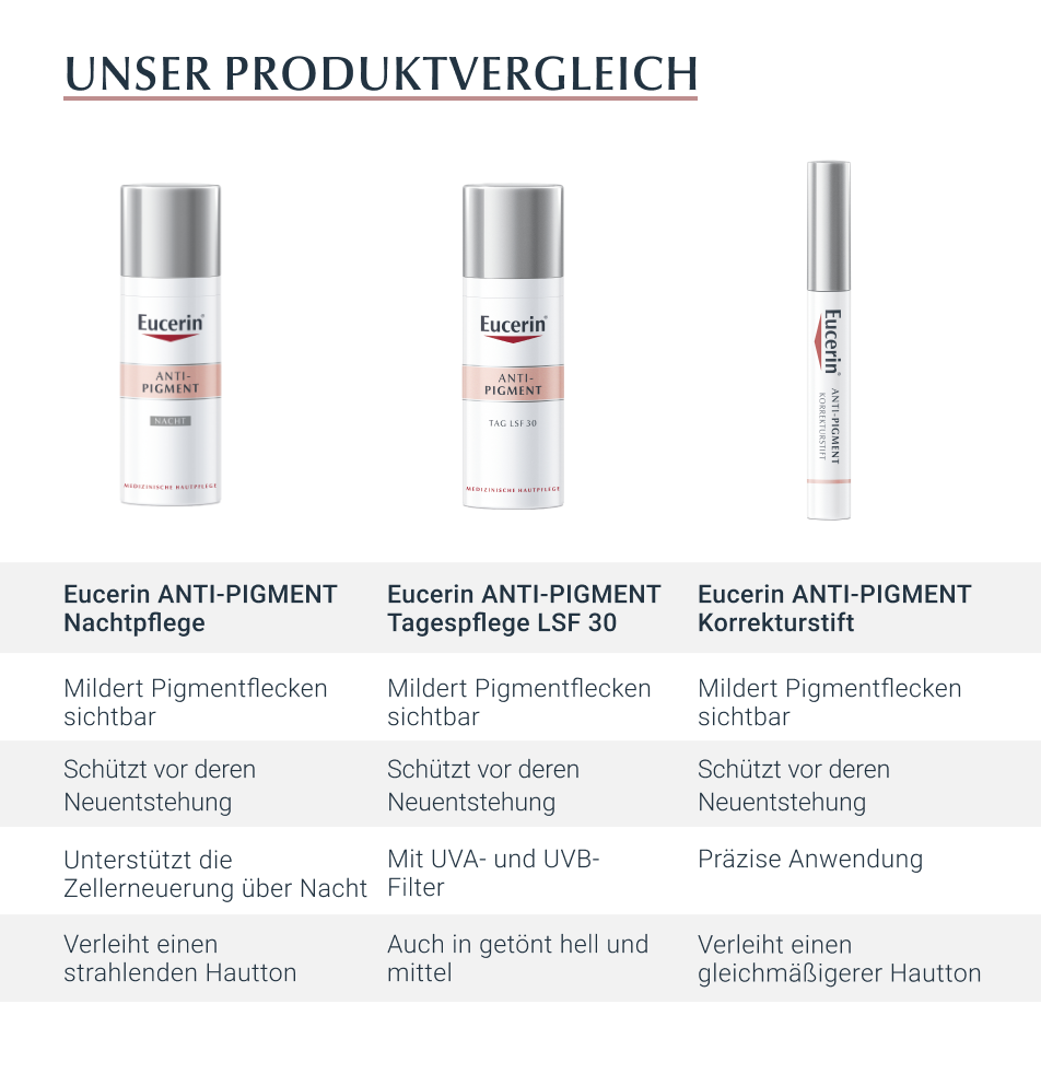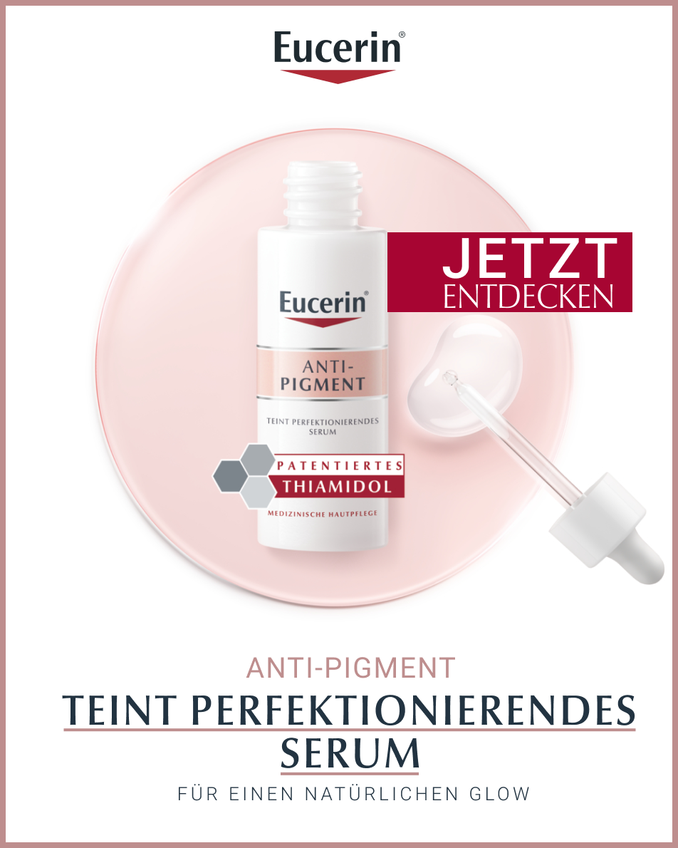 Das Eucerin Anti-Pigment Serum für einen perfektionierten Teint enthält langkettige Hyaluronsäure und Glycerin, wodurch die Haut mit Feuchtigkeit aufgepolstert wird. Zusätzlich wird der Haut so ein natürlicher Glow verliehen. Dank der Kristall-Technologie ist die Textur besonders schnell einziehend und leicht, sodass das Anti-Pigment Serum in jede Hautpflege-Routine integriert werden kann. Patentiertes Thiamidol® in dem Pigmentfleckenserum verleiht ein gleichmäßiges und strahlendes Hautbild. Erste Ergebnisse sind schon nach 2 Wochen Anwendung des Serums gegen Pigmentflecken sichtbar. Die gute Hautverträglichkeit und die Pflegewirksamkeit des Anti Pigmentflecken Serums sind klinisch und dermatologisch erwiesen.