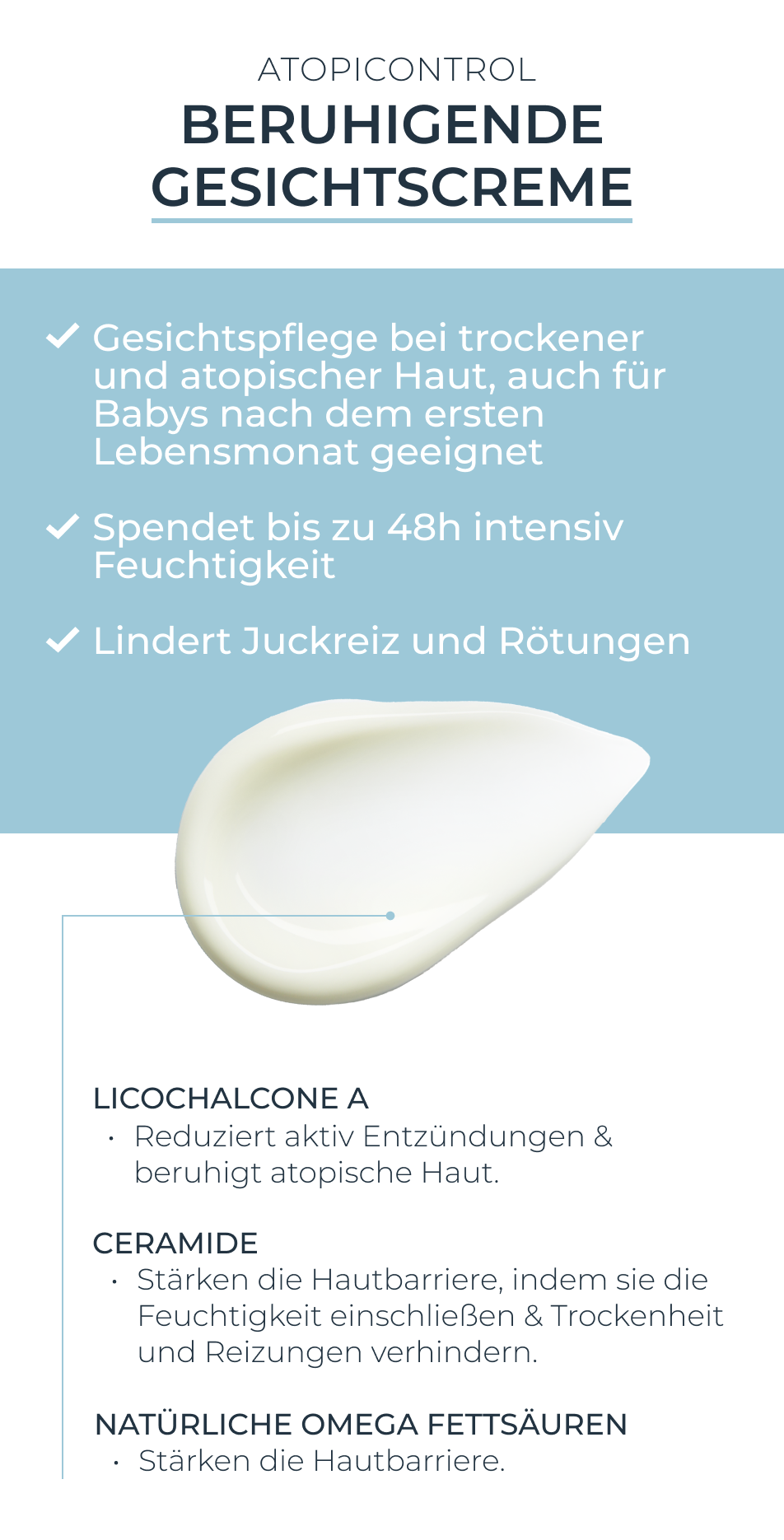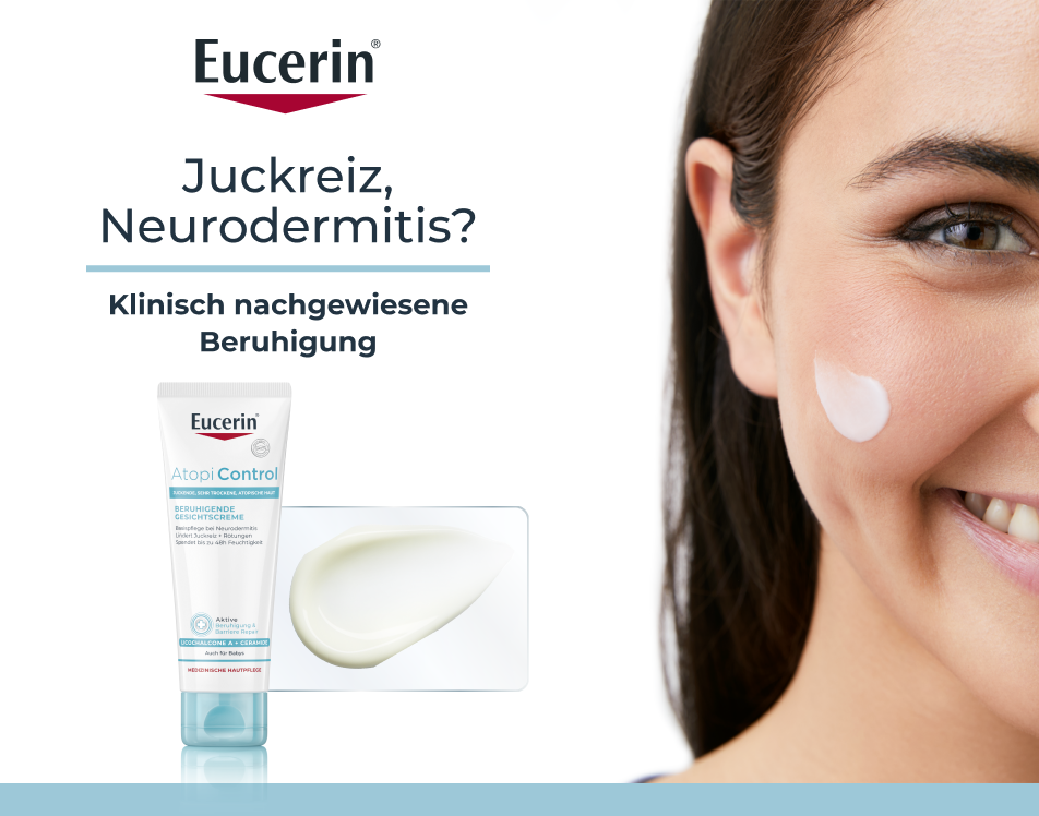 Eucerin AtopiControl Gesichtscreme ist eine leichte Gesichtspflege für trockene, rissige Haut und zur Behandlung während symptomfreien Phasen bei Neurodermitis geeignet. In akuten Phasen der Neurodermitis sollte Eucerin AtopiControl Akutpflege Creme verendet werden. Die enthaltenen Wirkstoffe wie Omega-6-Fettsäuren und Licochalcone A wirken beruhigend und glätten die Gesichtshaut. Zudem werden Juckreiz und Rötungen gelindert. Die Eignung während atopischen Phasen und die Verwendung bei Kindern und Babys ist dermatologisch bestätigt. Da die Hautpflege keine Duftstoffe enthält, ist das Risiko für Hautirritationen und Allergien sehr gering. Die Hautpflege zieht schnell ein und eignet sich auch sehr gut als Make-up Unterlage/Primer.