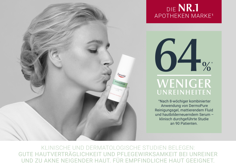 Das Eucerin DermoPure Mattierende Fluid hilft effektiv bei anspruchsvoller, unreiner, zu Akne neigender Haut und Pickeln. Außerdem können die Unreinheiten langfristig kontrolliert werden. Die Gesichtspflege kombiniert mehrere Inhaltsstoffe für ein reineres und mattiertes Hautbild: Salicylsäre reduziert Hautunreinheiten und beugt ihrer Neuentstehung vor, Licochalcone A beruhigt bei Hautirritationen und reduziert Gesichtsrötungen, die sebumregulierende Technologie hilft die überschüssige Talg-Produktion zu hemmen und mattierende Partikel sorgen für einen 8-stündigen Anti-Glanz Effekt, ohne die Poren zu verstopfen.