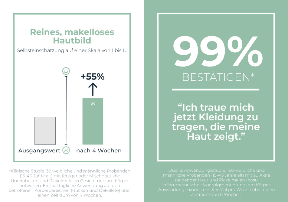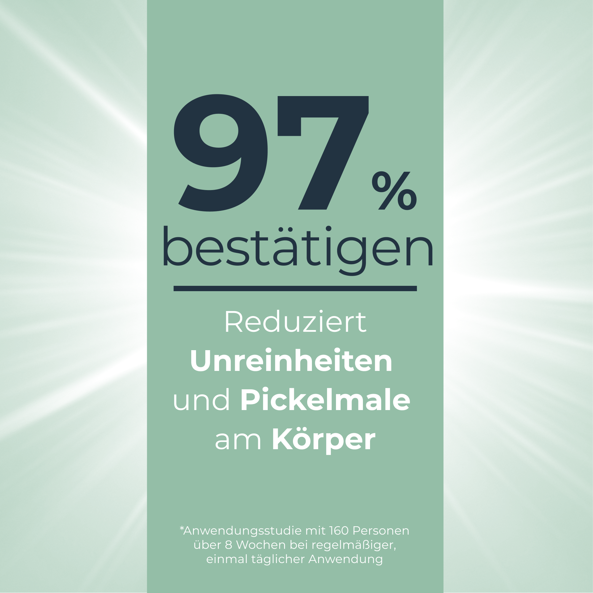 Als Soforteffekt beruhigt die Feuchtigkeitscreme für den Körper die Haut und spendet ihr Feuchtigkeit. Nach zwei Wochen sorgt die Creme zur Akne Behandlung für sichtbar reinere und ebenmäßigere Haut. 97% der Testenden bestätigen: Reduziert Hautunreinheiten und Pickelmale am Körper.*
