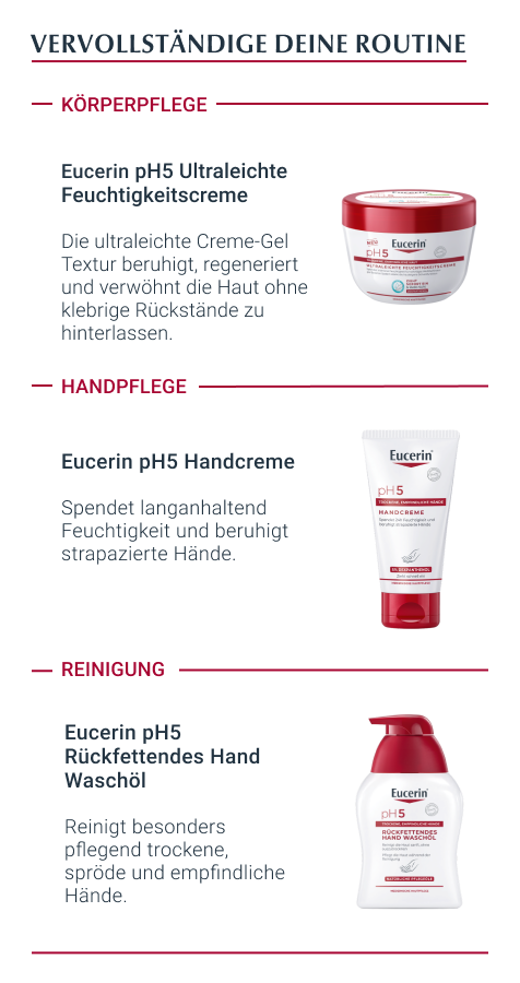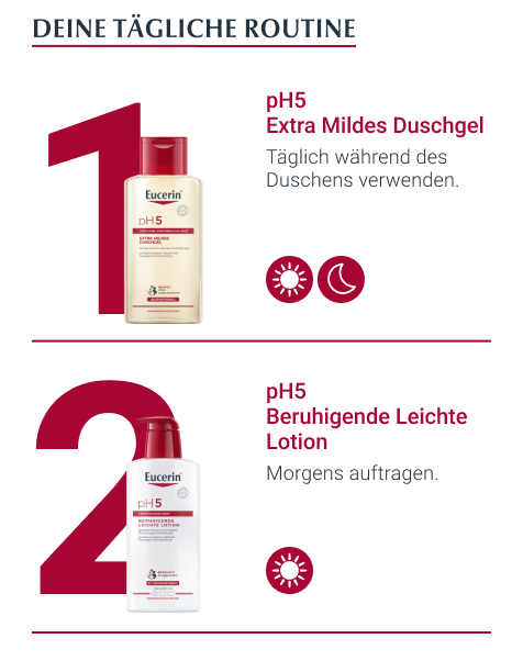 - Für beste Ergebnisse in Kombination mit einem feuchtigkeitsspendenden Pflegeprodukt aus der Eucerin PH5 Produktserie verwenden