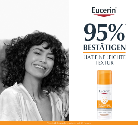 Eucerin Photoaging Control Tinted Face Sun Gel-Creme LSF50+ Mittel ist unparfümiert mit einer ultraleichten, lange deckenden und schnell einziehenden Textur für alle Hauttypen. Sie ist klinisch und dermatologisch getestet und auch empfindliche Haut verträgt sie sehr gut. 4 Tage nach einer Laser- oder Peelingbehandlung kann die Eucerin Sonnencreme angewendet werden.