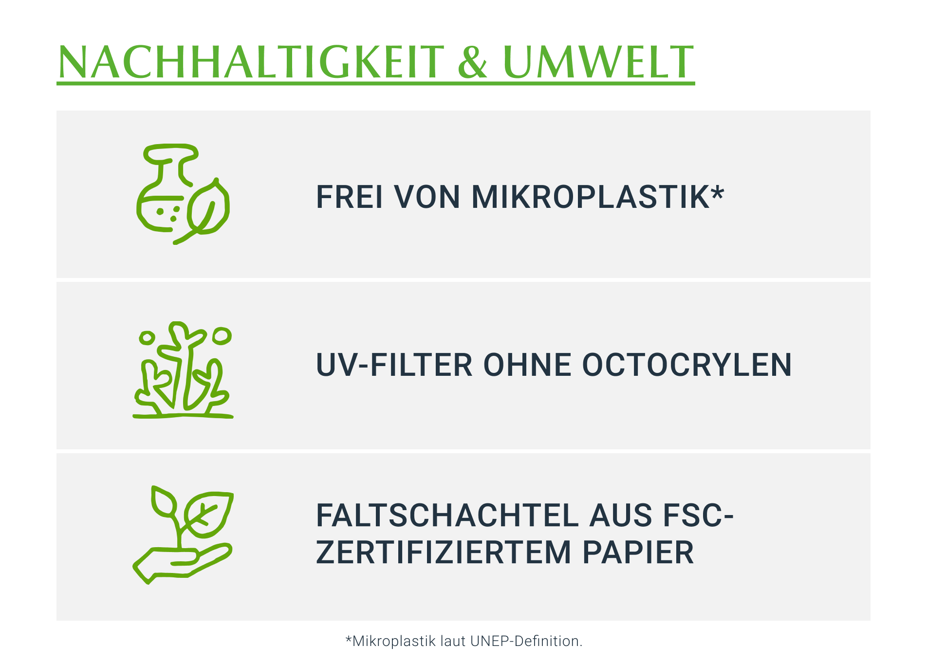 Durch die schützende Formel mit Hyaluronsäure werden die ersten Zeichen der Hautalterung reduziert, beispielsweise erste Fältchen, zusätzlich schützt sie vor sonnenbedingten Hautschäden.