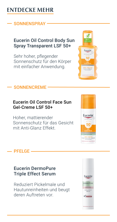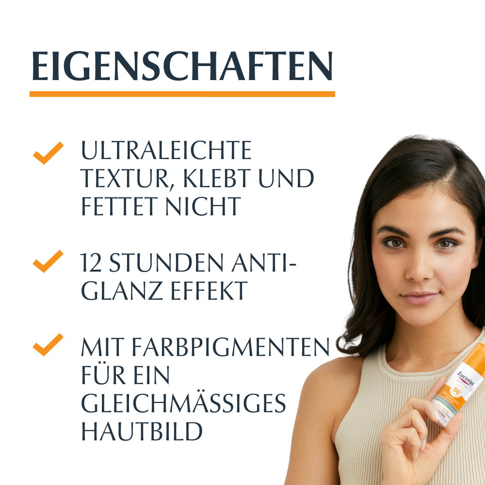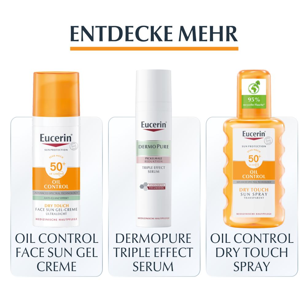 Eucerin Oil Control Tinted Face Sun Gel-Creme LSF 50+ Mittel ist ein Sonnenschutz mit Farbpigmenten für die tägliche Anwendung für unreine, zu Akne neigende Haut.