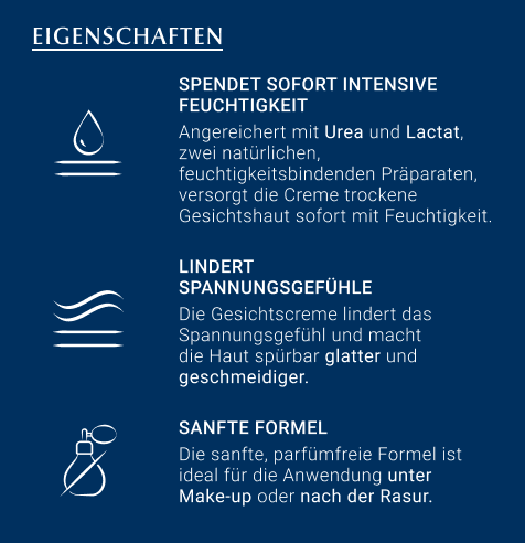 Die Hautpflege ist mit Urea und Lactat, zwei natürlichen sowie feuchtigkeitsbindenden Präparaten, angereichert. Dies sorgt für eine schnelle und langanhaltende Versorgung mit Feuchtigkeit und raue Haut wird damit glatter. Auch nach der Rasur, bei zu Schuppung neigender Haut und bei Juckreiz bietet die Creme eine wirksame Pflege.