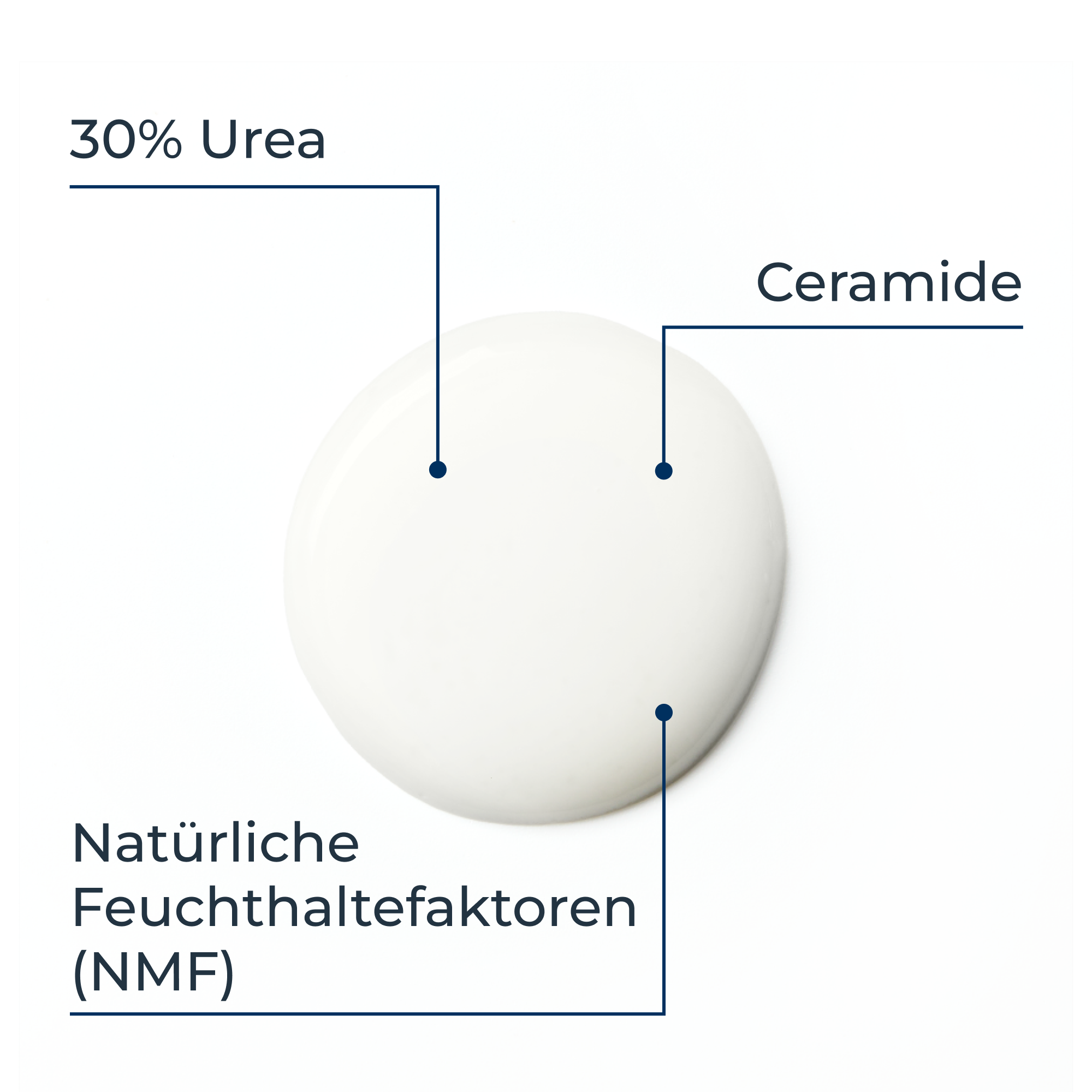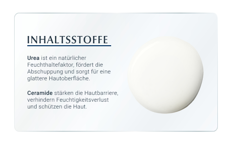 Die Hautcreme enthält verschiedene Wirkstoffe: Hoch-konzentriertes 30% Urea exfoliert, während Ceramide und andere natürliche Feuchthaltefaktoren die Hautbarierre reparieren und die Haut mit Feuchtigkeit versorgen, indem sie Wasser an die Haut binden.