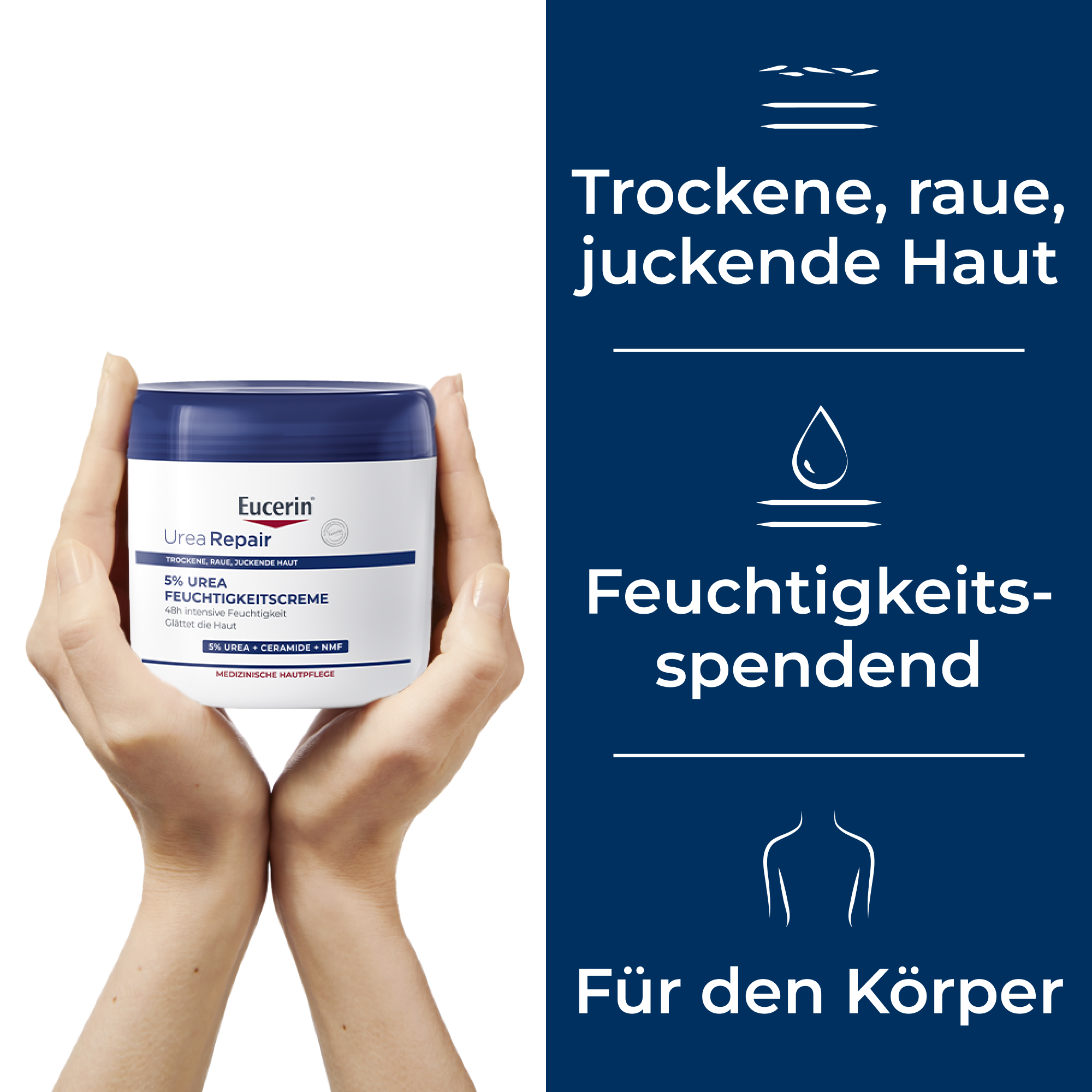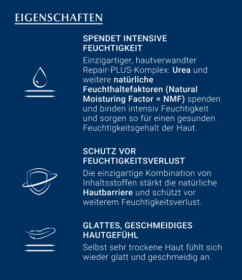 Die Eucerin UreaRepair PLUS >Feuchtigkeitscreme 5% ist eine Pflegecreme für sehr trockene Haut. Die Zeichen trockener Haut wie eine raue Oberfläche, Juckreiz und Spannungsgefühl können mit dieser Bodylotion gemildert werden. Dafür spendet die Hautcreme mit ihrer cremigen Textur und den Inhaltsstoffen Urea sowie weiteren natürliche Feuchthaltefaktoren intensiv Feuchtigkeit und hilft, diese in der Haut zu binden. Mit den enthaltenen Ceramiden wird die Hautbarierre gestärkt, damit die Feuchtigkeit nicht entweichen kann. Die Kombination dieser wirksamen Inhaltsstoffe bringt den Lipid-(Fett-) und Feuchtigkeitshaushalt der Haut wieder in ein natürliches Gleichgewicht. Zusätzlich wird die Widerstandskraft der Haut gestärkt, wodurch sie 48 h lang anhaltend vor Trockenheit geschützt wird.