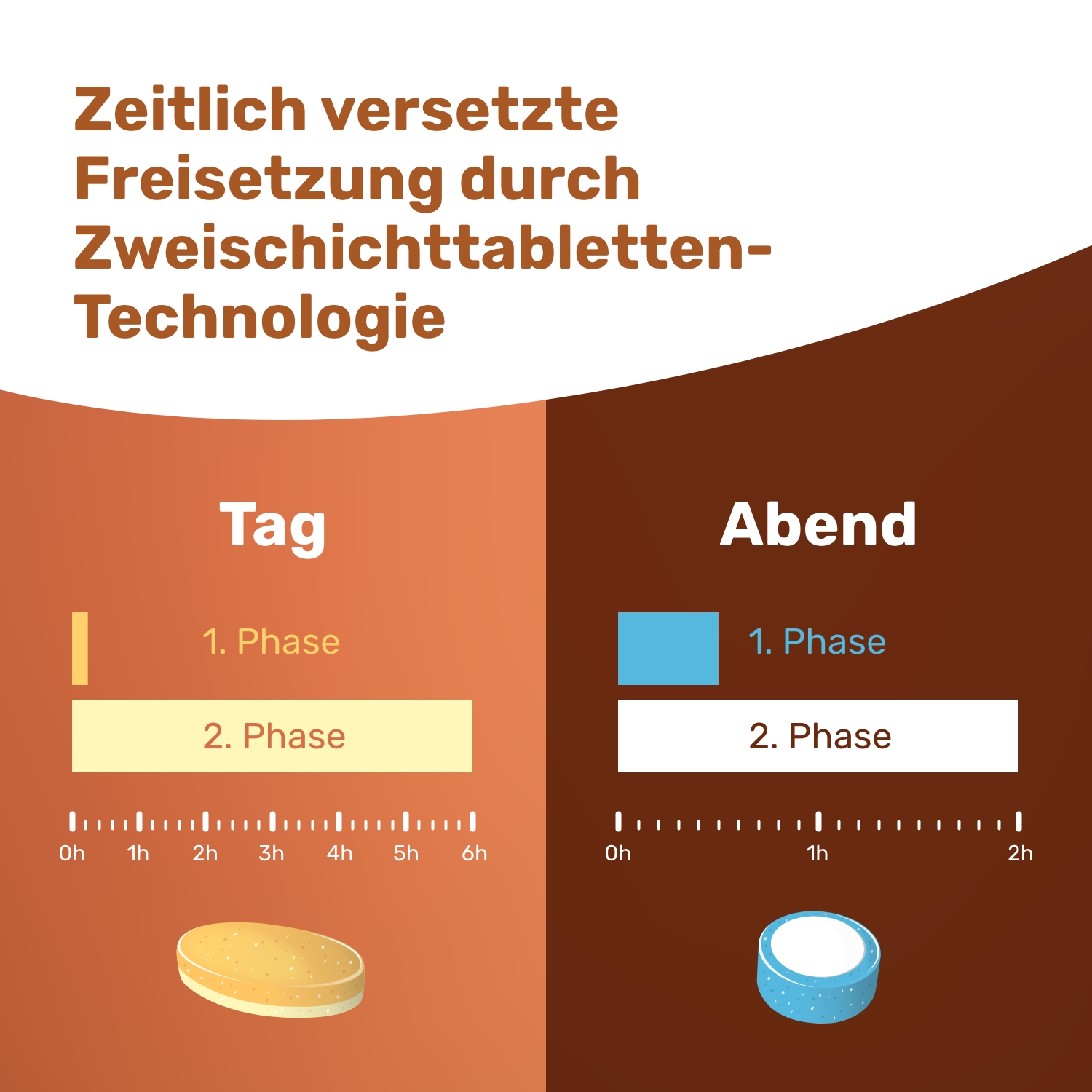 Eine gelb-weiße Morgen-Tablette vor dem Frühstück. Eine blau-weiße Abend-Tablette frühestens eine Stunde nach der letzten Mahlzeit.