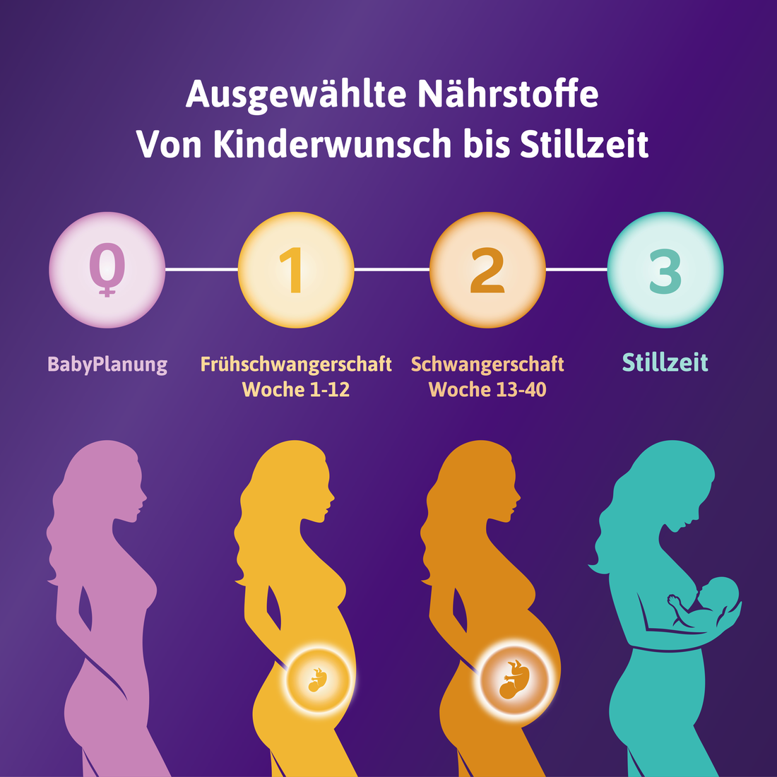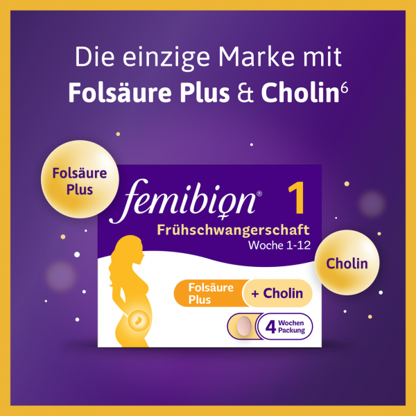 Mit Beginn des ersten Trimesters deiner Schwangerschaft möchtest du deinem Baby einen gesunden Start ins Leben ermöglichen.1Eine Schwangerschaft bereitet dich darauf vor, neues Leben in der Welt willkommen zu heißen. Ab der 1.Woche beginnt das erste Trimester und dein Körper benötigt von vielen Nährstoffen eine größere Menge, um dich und dein Baby zu unterstützen. Femibion® 1 Frühschwangerschaft enthält 800 μg Folsäure Plus¹ (eine Kombination aus Folsäure und Metafolin®), um den Folatspiegeleffektiv zu erhöhen.²Femibion® 1 Frühschwangerschaft enthält zusätzlich ausgewählte Nährstoffe, die auf deine Schwangerschaft abgestimmt sind: Cholin, Eisen, Vitamin B1, B2, B6, B12, C, D, E, Biotin, Niacin, Pantothensäure, Jod, Eisen und Selen. Femibionist die Nr. 1* Empfehlung von Gynäkologinnen und Gynäkologen und bietet ein abgestimmtes Produkt für jede Phase von Kinderwunsch bis Stillzeit.Ausgewählte Nährstoffe von Woche 1 bis 13Eine ausreichende Folsäurezufuhr ist während der gesamten Schwangerschaft, vor allem aber während des ersten Trimesters unerlässlich. Ein niedriger mütterlicher Folatspiegel ist ein Risikofaktor für die Entstehung von Neuralrohrdefekten deines ungeborenen Babys.1Der Folatbedarf bleibt bis zum Ende der Schwangerschaft und während der Stillzeit erhöht. Ausgewählte Vitamine und Mineralstoffe in nur einer Tablette pro Tag¹Femibion®-Produkte enthalten Folsäure Plus (eine Kombination aus Folsäure und Metafolin®) sowie ausgewählte Nährstoffe. Metafolin® ist eine Form von Folat, welche direkt vom Körper aufgenommen werden kann und hilft, den Folatspiegelzu erhöhen, welcher für die gesunde Entwicklung deines Babys wichtig ist.¹ Metafolin® ist eine eingetragene Marke der Merck KGaA, Darmstadt, und wird unter Lizenz verwendet.Die zusätzliche Folsäureaufnahme erhöht den mütterlichen Folatspiegel. Ein niedriger mütterlicher Folatspiegelist ein Risikofaktor für die Entstehung von Neuralrohrdefekten beim heranwachsenden Fötus. Deshalb wird Frauen empfohlen, zusätzlich 400 Folsäure täglich für mindestens einen Monat vor und bis zu drei Monate nach der Empfängnis einzunehmen. Es gibt wissenschaftliche Nachweise, die nahelegen, dass ein niedriger mütterlicher Folatspiegel ein signifikanter Risikofaktor für die Entwicklung von Neuralrohrdefekten ist. Es gibt jedoch auch andere Risikofaktoren. Daher kann die Veränderung eines einzelnen Faktors eine vorteilhafte Wirkung haben oder nicht. Folat bleibt auch in der späteren Schwangerschaft wichtig, da es zum Wachstum des mütterlichen Gewebes (z.B. der Plazenta) beiträgt. Die Plazenta versorgt das Baby mit allen Nährstoffen. Daher sollte während der gesamten Schwangerschaft auf eine ausreichende Folsäurezufuhr geachtet werden.Femibion® 2 und Femibion® 3 enthalten außerdem DHA (mehrfach ungesättigte Omega-3-Fettsäure).