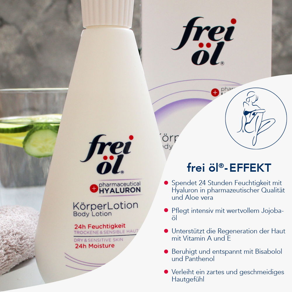 Die leichte KörperLotion hüllt Ihre Haut in pures Wohlgefühl. Das Hyaluron in reiner pharmazeutischer Qualität und Aloe vera dringen intensiv in die Haut ein und versorgen sie für 24 Stunden mit viel Feuchtigkeit. Natürliches Jojobaöl sorgt für zarte Pflege, Vitamin A und E unterstützen die Regeneration, während Panthenol und Bisabolol die Haut zusätzlich beruhigen. Der Unterschied ist sofort spürbar – die KörperLotion zieht schnell ein und fettet nicht. Die Haut fühlt sich geschmeidig an und sieht gepflegt aus. Ideal für trockene und sensible Haut. frei öl® KörperLotion – Tag für Tag sanfte Pflege für ein spürbar entspanntes Hautgefühl.