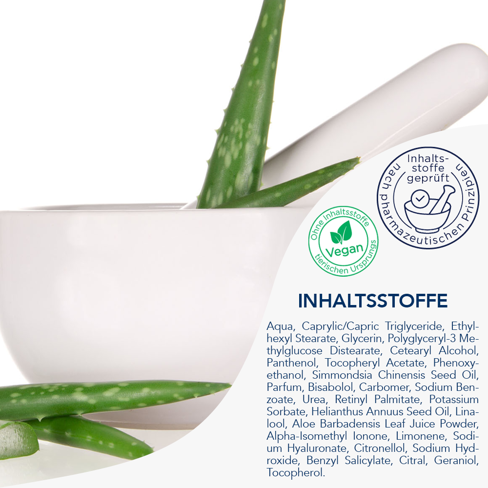 • Spendet 24 Stunden Feuchtigkeit mit Hyaluron in pharmazeutischer Qualität und Aloe vera