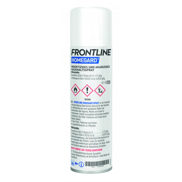 FRONTLINE HOMEGARD® enthält zwei Wirkstoffe. Permethrin, der erste Wirkstoff, leitet sich strukturell von den natürlichen Pyrethrinen ab, die von bestimmten Chrysanthemen-Arten gebildet werden. Sie werden in verschiedenen Produkten zur Schädlingsbekämpfung eingesetzt. Kommt ein Floh mit Permethrin in Kontakt, wird er durch den Wirkstoff gelähmt und schließlich abgetötet. (S)-Methopren, der zweite Wirkstoff, ähnelt einem Wachstumshormon der Flöhe. Er vermindert die Schlupffähigkeit der Floheier und verhindert die Entwicklung der Larven zu Flohpuppen. Durch diese Wirkweise wird die Vermehrung der Flöhe gehemmt. Beide Substanzen wirken gezielt im Parasiten und stellen bei bestimmungsgemäßem Gebrauch keine Gefahr für den Menschen dar.