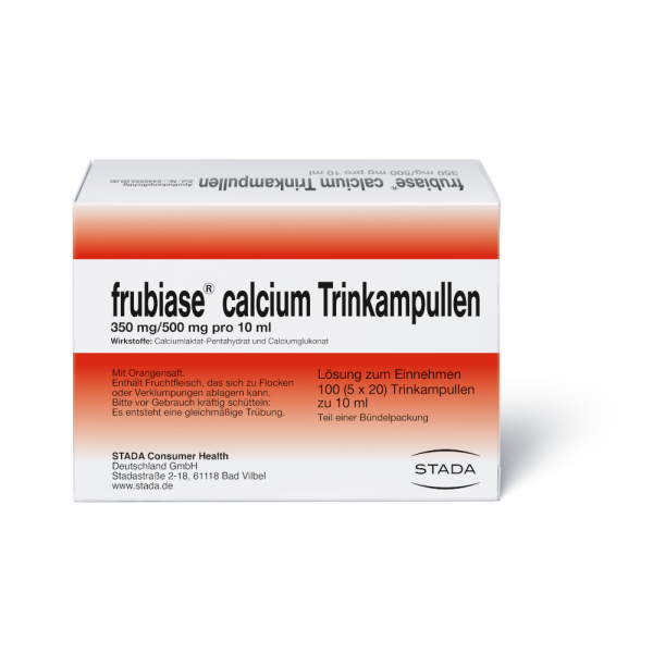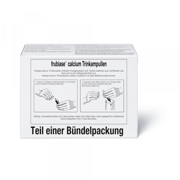 frubiase® calcium Trinkampullen. Anwendungsgebiete: Zur Vorbeugung eines Calciummangels bei erhöhtem Bedarf (z. B. Wachstumsalter, Schwangerschaft und Stillzeit), zur unterstützenden Behandlung der Osteoporose. Enthält Sorbitol.