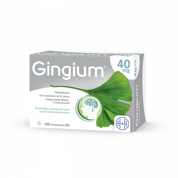 Damit das Gehirn seinen vielfältigen Aufgaben gut nachkommen kann, braucht es ausreichend Nährstoffe und Sauerstoff. Gingium® 40 mg hilft dabei, indem es die Durchblutung im Gehirn fördert und dadurch Gedächtnis und Konzentration verbessert.a Zudem kann Gingium® 40 mg durch die bessere Durchblutung auch die Regeneration des Innenohrs bei Tinnitusb unterstützen. Der hochwertige Spezialextrakt wird aus den Blättern des Ginkgo-Baumes gewonnen, weist eine hohe Konzentration natürlicher Wirkstoffe (Flavonglykoside, Terpenlactone) auf und ist gut verträglich.