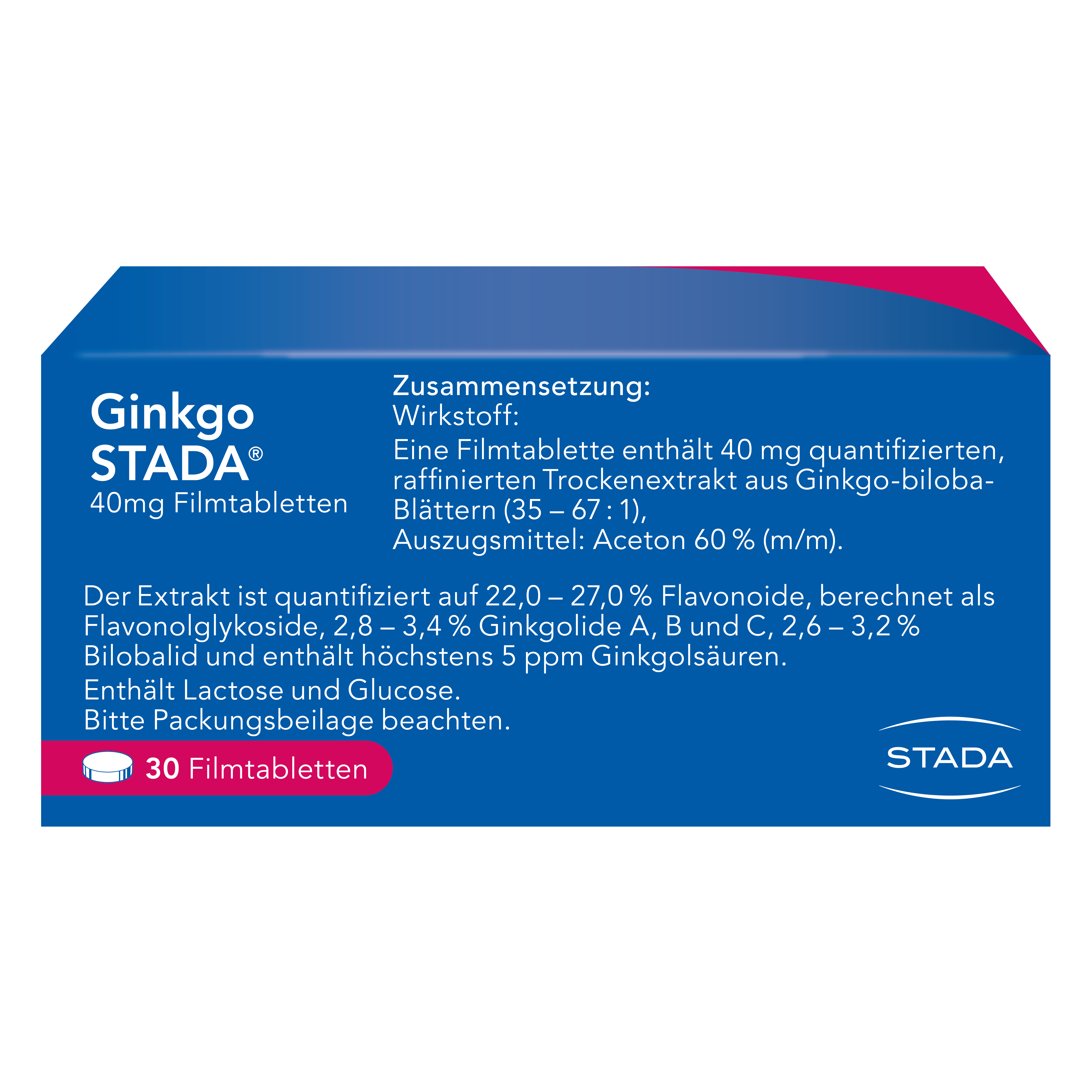 Ginkgo STADA® 40 mg Filmtabletten fördert die Durchblutung des Gehirns, stärkt Gedächtnis und Konzentration,* zur dauerhaften Anwendung, hohe Extraktqualität * Bei altersbedingt nachlassender geistiger Leistungsfähigkeit.