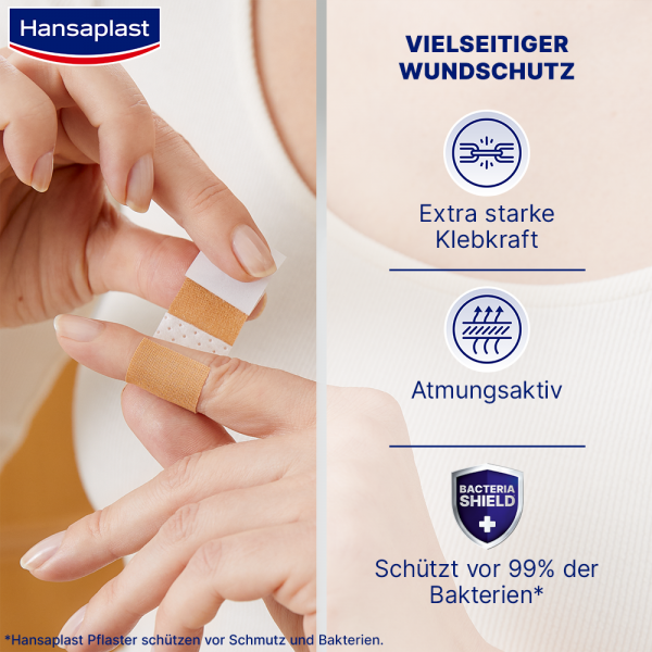 Das Hansaplast Bacteria Shield schützt vor Schmutz und 99% der Bakterien. Zudem ist das Hansaplast Pflaster widerstandsfähig und atmungsaktiv, wodurch eine ungestörte Wundheilung ermöglicht wird. Das Material bietet außerdem eine extra starke Klebkraft und so haftet das Pflaster zuverlässig auf der Haut.