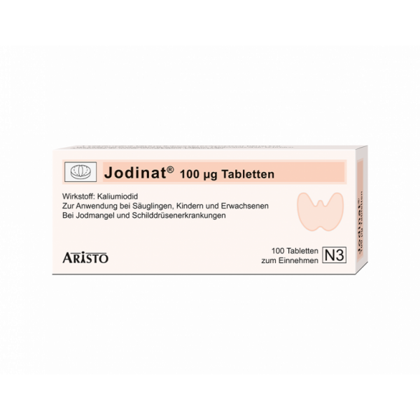Jodinat 100 µg Tabletten. Wirkstoff: Kaliumiodid. Anwendungsgebiete: zur Vorbeugung eines Kropfes bei unzureichender Iodzufuhr über die Nahrung, insbesondere in Schwangerschaft und Stillzeit, zur Vorbeugung eines erneuten Kropfwachstums nach Abschluss einer Kropfbehandlung oder nach einer Kropfoperation und zur Behandlung eines Iodmangelkropfes bei Neugeborenen, Kindern und Jugendlichen.