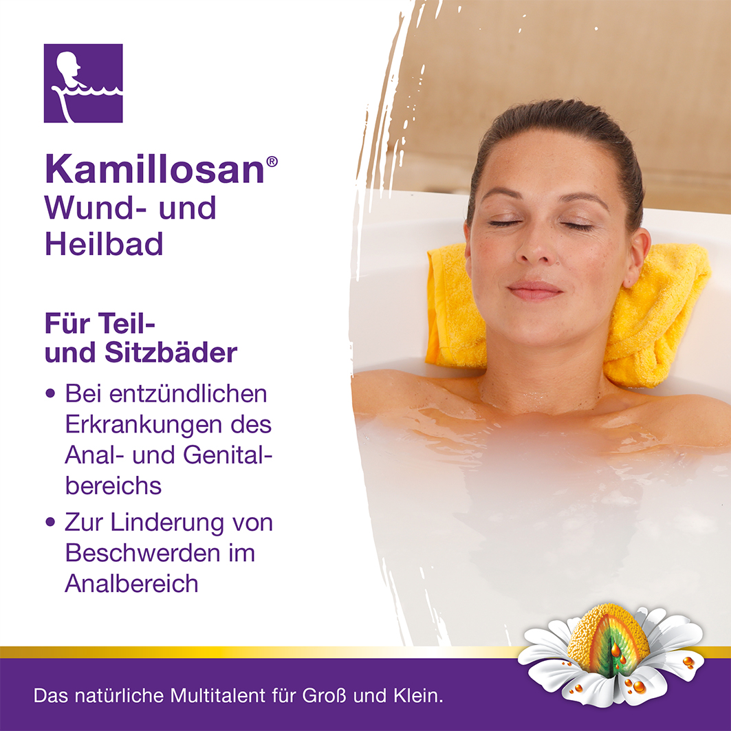 Oder: Bereiten Sie mit dem Arzneimittel ein warmes Bad zu. Die Dauer eines Teil- oder Sitzbades sollte 5-10 Minuten nicht überschreiten. Lassen Sie sich zur Anwendung des Arzneimittels von Ihrem Arzt oder Apothker beraten.