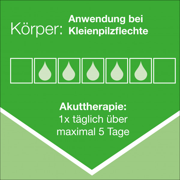 Die Anwendungsdauer bei Hautflechte durch Kleienpilz (Pityriasis versicolor) beträgt zur Behandlung maximal 5 Tage und zur Vorbeugung gegen ein Wiederauftreten maximal 3 Tage.