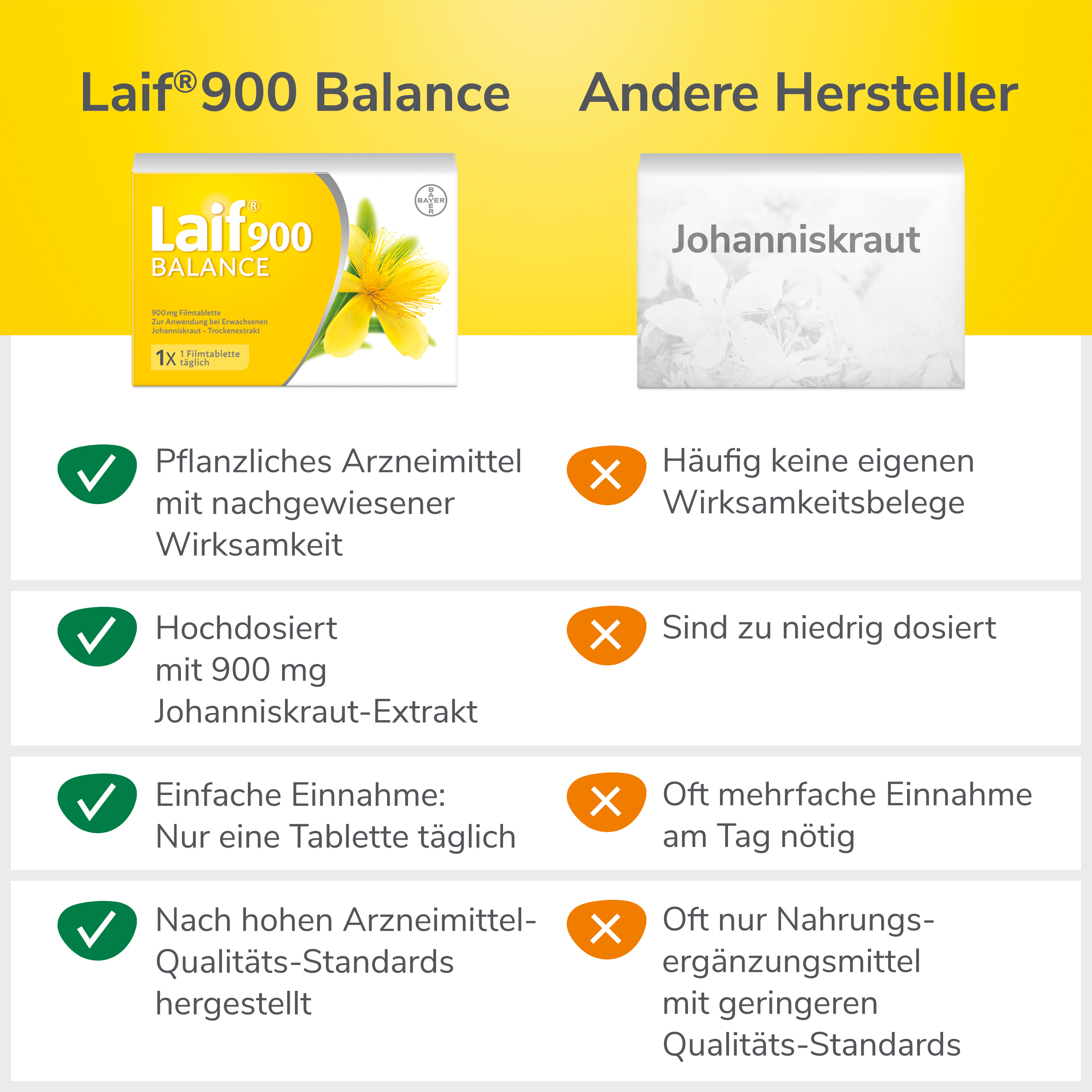 Als pflanzliches Arzneimittel ist Laif 900 Balance gut verträglich und es verursacht keine Sedierung und keine Gewöhnungseffekte. Zudem ist das Präparat mit nur einer Tablette am Tag leicht einzunehmen. Diese enthält bereits die optimale Tagesdosis von 900 mg Johanniskraut-Extrakt
