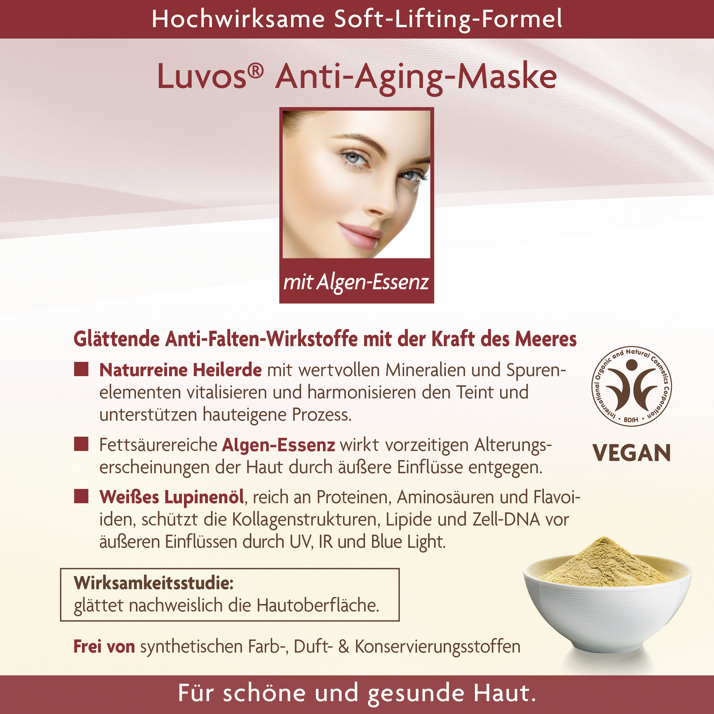 Zertifizierte Naturkosmetik, hergestellt in Deutschland: das Familienunternehmen Luvos mit 100-jähriger Tradition stellt dieses Produkt nach höchstem Standard von BDIH her. Es ist selbstverständlich vegan, tierversuchsfrei. Die Hautverträglichkeit ist dermatologisch bestätigt. Die Anti-Aging-Maske ist vollkommen frei von problematischen Zusatzstoffen wie Mikroplastik, Mineralöl, Parabenen, Silikonen, Paraffinen, PEGs, künstlichen Farb-, Duft- und Konservierungsstoffen.