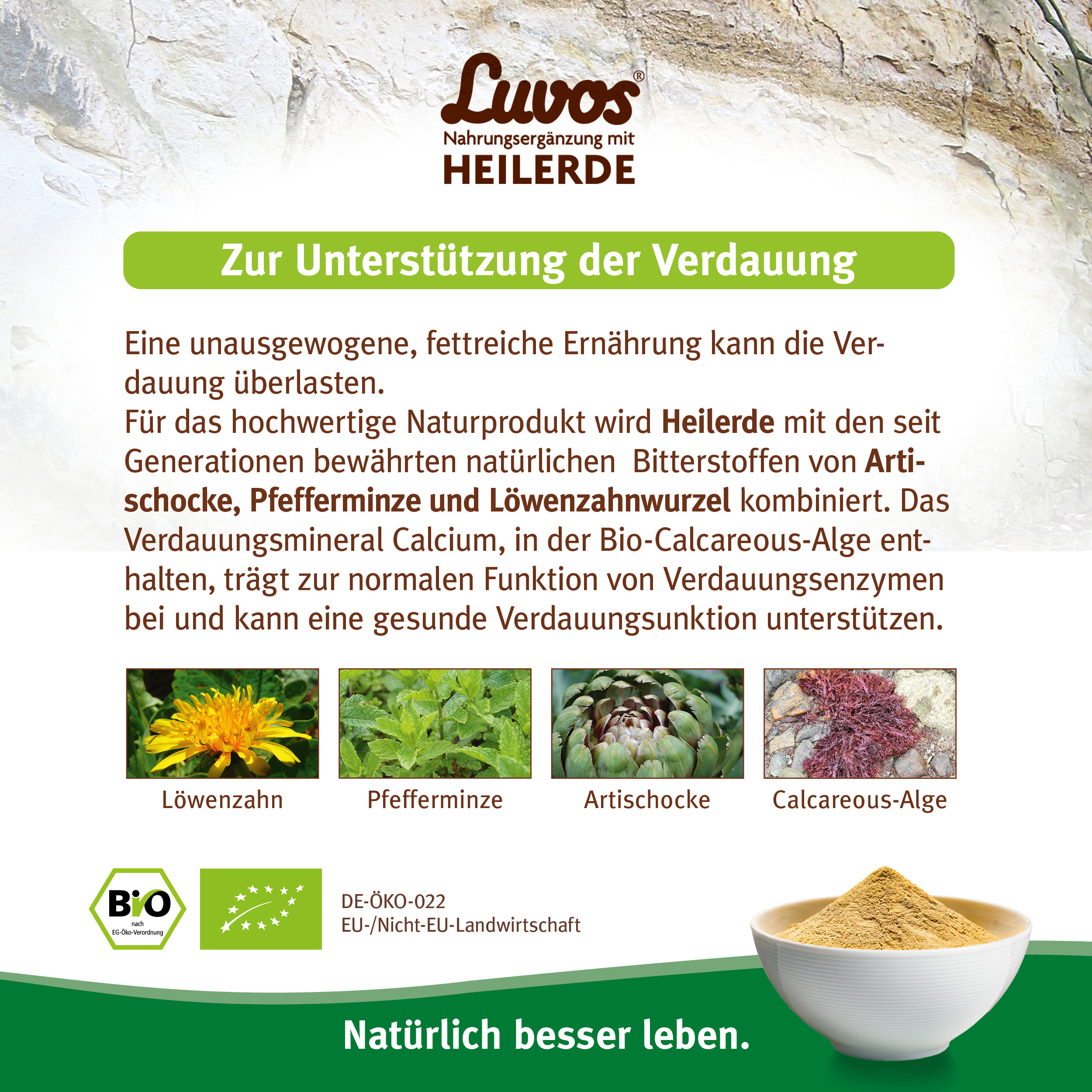 Luvos Bitterquell Plus ist ein optimal abgestimmter Bio-Komplex mit Heilerde und natürlichen, bio-zertifizierten Zutaten. Das hochwertige Naturprodukt kombiniert die Heilerde mit bewährten pflanzlichen Naturstoffen: Bio-Artischocke, Bio-Pfefferminze und Bio-Löwenzahnwurzel. Das Verdauungsmineral Calcium, in der Bio-Calcareous-Alge enthalten, trägt zur normalen Funktion von Verdauungsenzymen bei und kann eine gesunde Verdauungsfunktion unterstützen.