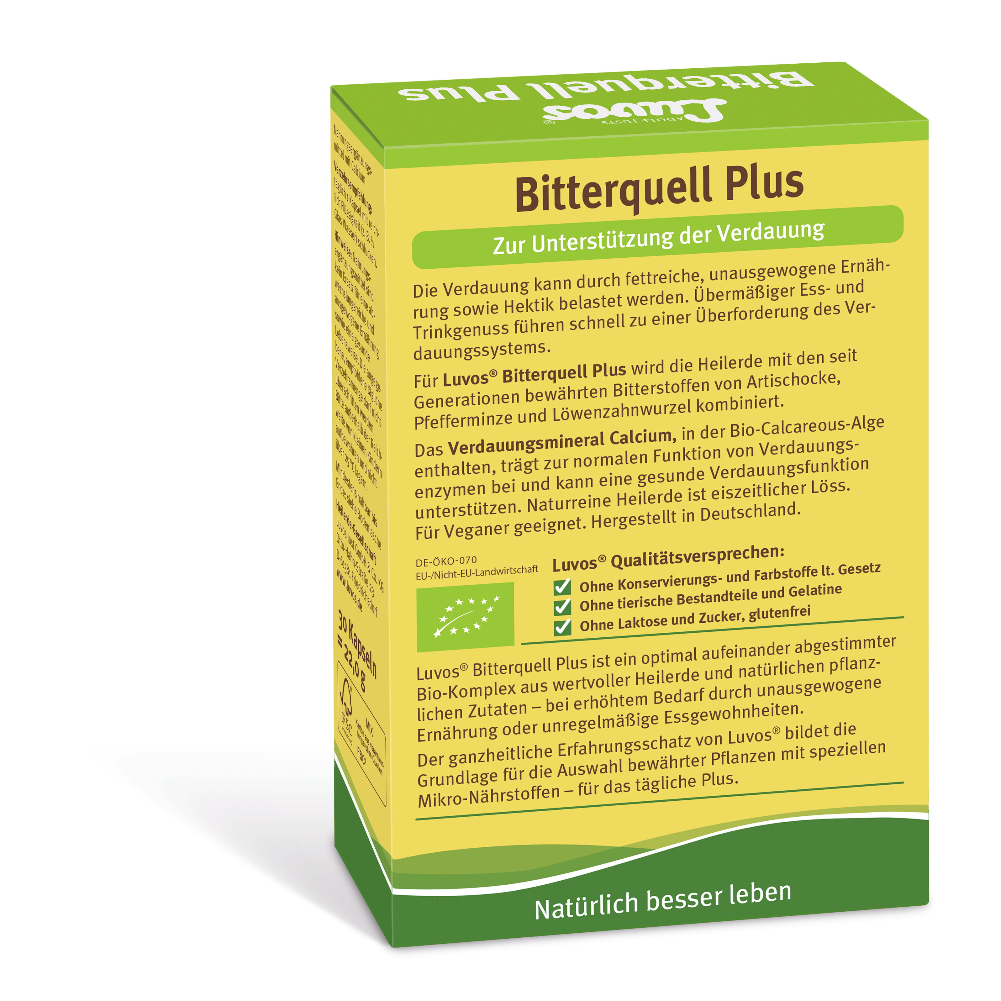Luvos Bitterquell Plus ist ein optimal abgestimmter Bio-Komplex mit Heilerde und natürlichen, bio-zertifizierten Zutaten. Das hochwertige Naturprodukt kombiniert die Heilerde mit bewährten pflanzlichen Naturstoffen: Bio-Artischocke, Bio-Pfefferminze und Bio-Löwenzahnwurzel. Das Verdauungsmineral Calcium, in der Bio-Calcareous-Alge enthalten, trägt zur normalen Funktion von Verdauungsenzymen bei und kann eine gesunde Verdauungsfunktion unterstützen.