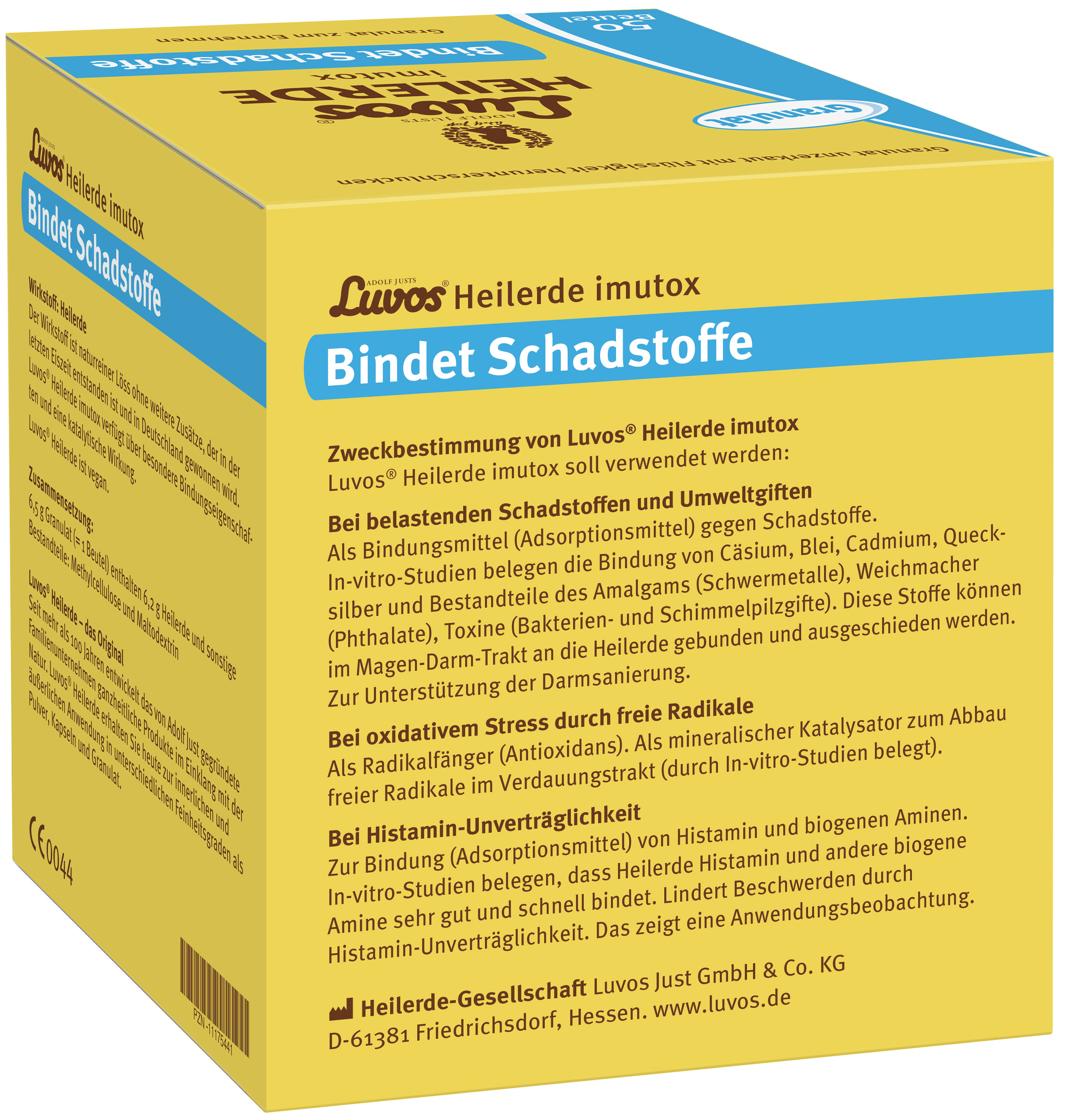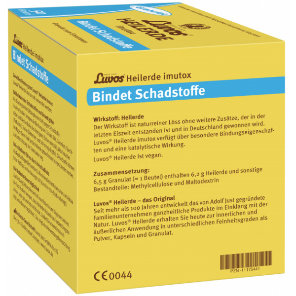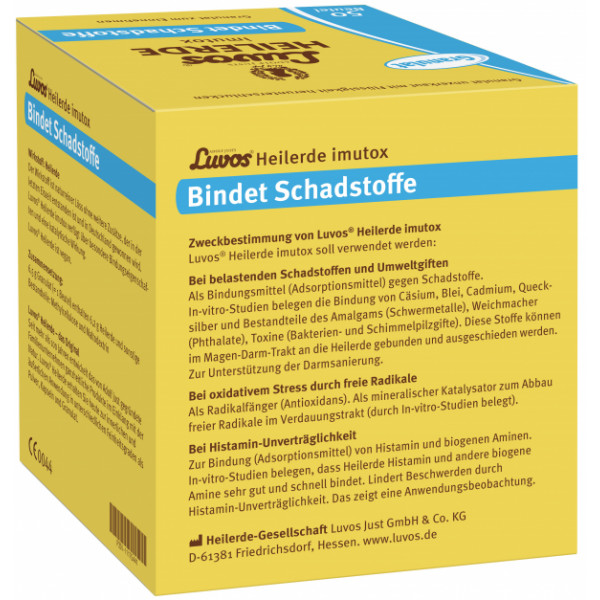 Adolf Justs Luvos® Heilerde imutox Pulver ist ein Medizinprodukt, das zur Unterstützung des Organismus bei der Körperentgiftung, Darmsanierung, Entschlackung sowie Entlastung der Leber und Niere durch Bindung von Schadstoffen und Umweltgiften aus der Nahrung verwendet wird. Beispielsweise werden gebunden: belastende Substanzen (radioaktives Cäsium), Schwermetalle (Blei, Cadmium, Quecksilber und Bestandteile des Amalgams), Weichmacher (Phthalate), Toxine (Bakterien- und Schimmelpilzgifte).