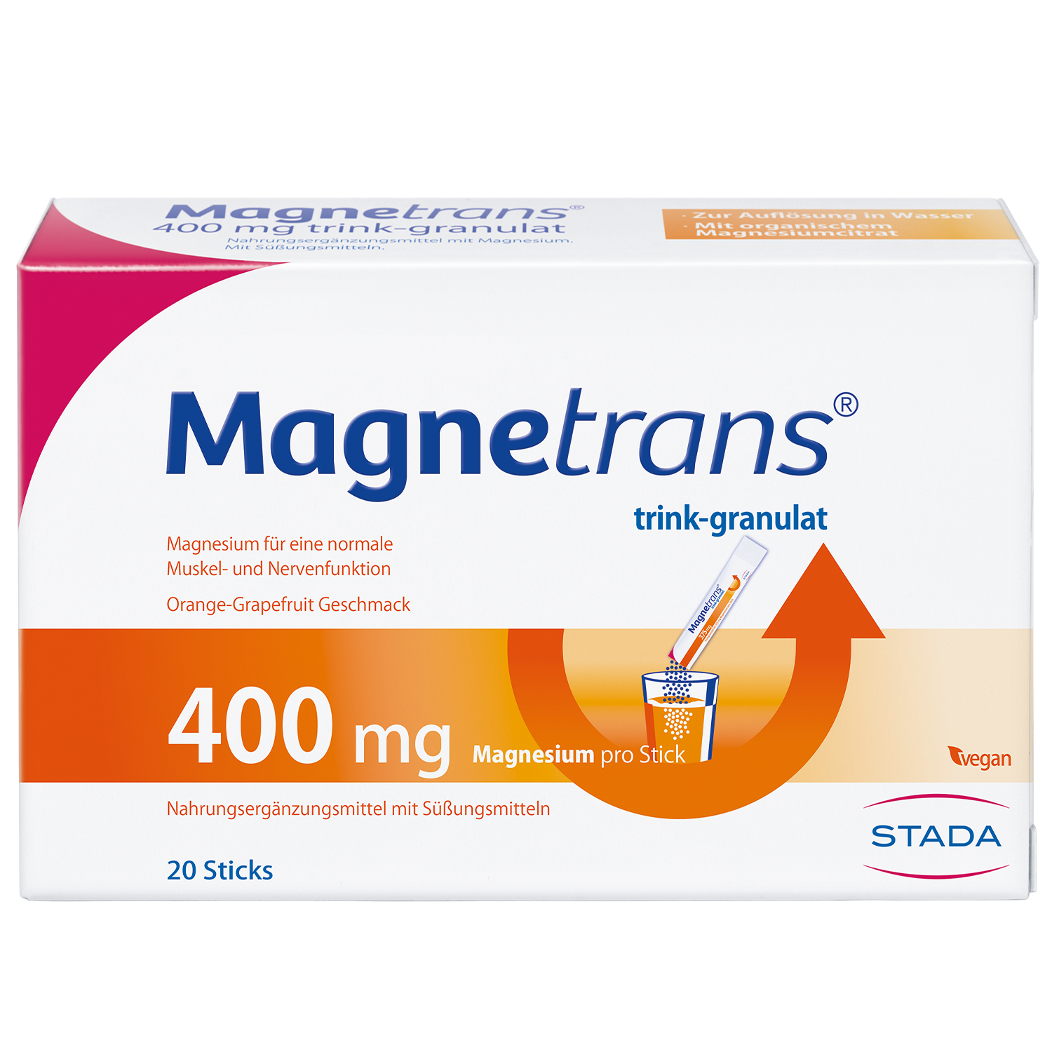 Füllen Sie nach dem Sport Ihre körpereigenen Magnesiumdepots auf! Magnetrans® trink-granulat 400 mg versorgt Sie mit 100 % des täglichen Magnesiumbedarfs1 in einer Portion. Einfach die Magnesium Sticks in einem Glas Wasser auflösen, umrühren, fertig. Schmeckt angenehm nach Orange-Grapefruit. Magnetrans® 400 mg trink-granulat ist laktose- und glutenfrei und geeignet für Veganer.