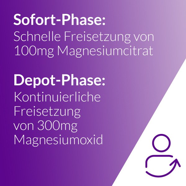 Magnesium hat für die normale Funktion unserer Muskeln und unseres Nervensystems große Bedeutung. Aber stressige Zeiten, große körperliche Anstrengungen oder ein sportlicher oder sehr aktiver Lifestyle können für einen erhöhten Magnesiumbedarf sorgen.Magnetrans® Depot 400mg unterstützt den Körper mit einer modernen 2-Phasen-Technologie mit insgesamt 400mg Magnesium. Der spezielle Aufbau der Tablette sorgt dafür, dass ein Teil des enthaltenen Magnesiums sofort nach der Einnahme innerhalb der ersten ca. 45 Minuten freigesetzt wird, während die verzögert einsetzende Depot-Phase ihn anschließend über mehrere Stunden hinweg mit Magnesium versorgt.