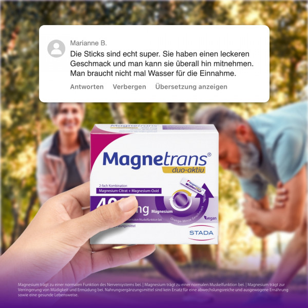 Magnesium kann bei übermäßigem Verzehr abführend wirken. Bei Einnahme von Abführmitteln oder Mitteln gegen Sodbrennen/saures Aufstoßen, die ebenfalls Magnesium enthalten, sollte auf den Verzehr von Magnetrans duo-aktiv 400 mg direkt-Granulat verzichtet werden. Personen mit eingeschränkter Nierenfunktion sollten vor dem Verzehr ihren Arzt befragen. Das Produkt ist nicht für Kinder (unter 12 Jahren) geeignet.