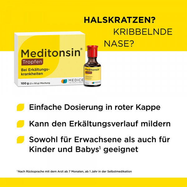Meditonsin® eignet sich schon für Kinder ab 1 Jahr in der Selbstmedikation. Bei Säuglingen ab 7 Monaten kann Meditonsin® nach Rücksprache mit dem Arzt eingesetzt werden, denn Meditonsin® ist verträglich und schont den Organismus.