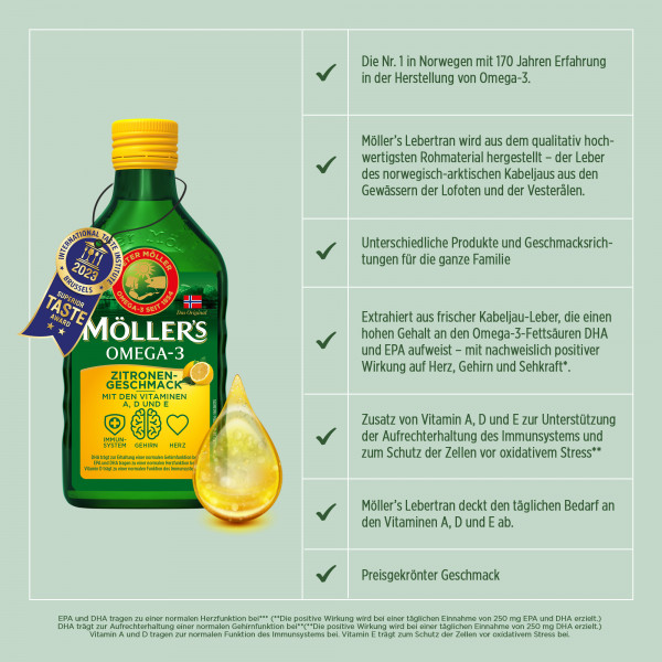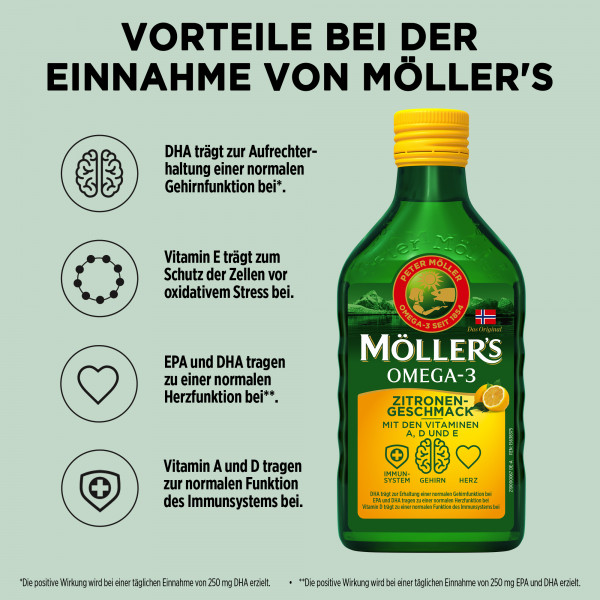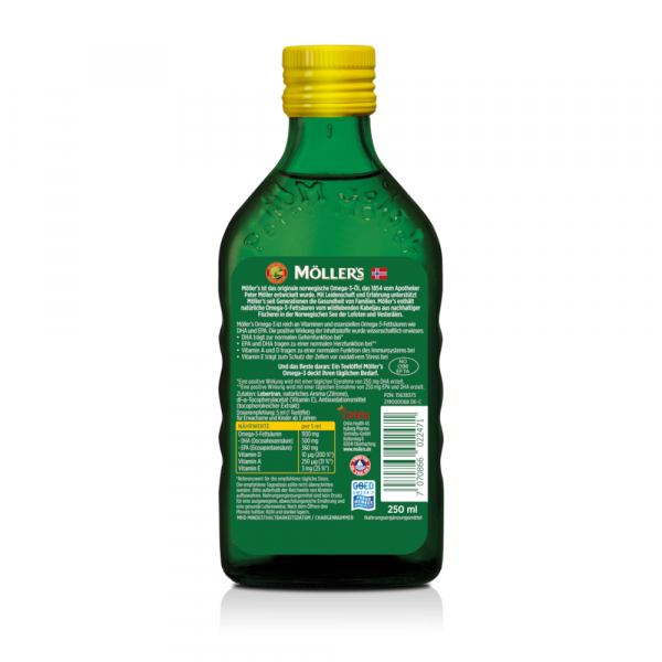 Möller’s ist das wohlschmeckende, original norwegische Omega-3-Öl, das seit 1854 einen wertvollen Beitrag zur Gesundheit der skandinavischen Bevölkerung leistet. Omega-3-Fettsäuren gehören zu den lebenswichtigen Nährstoffen, die der Körper nicht selbst produzieren kann. Sie kommen v.a. in fettem Fisch wie Lachs oder Hering vor, aber wer nicht gerne Fisch isst, kann mit nur einem Teelöffel Möller‘s pro Tag seinen Bedarf ganz einfach und bekömmlich decken. Möller’s – Ein Löffel voll Leben für die ganze Familie.