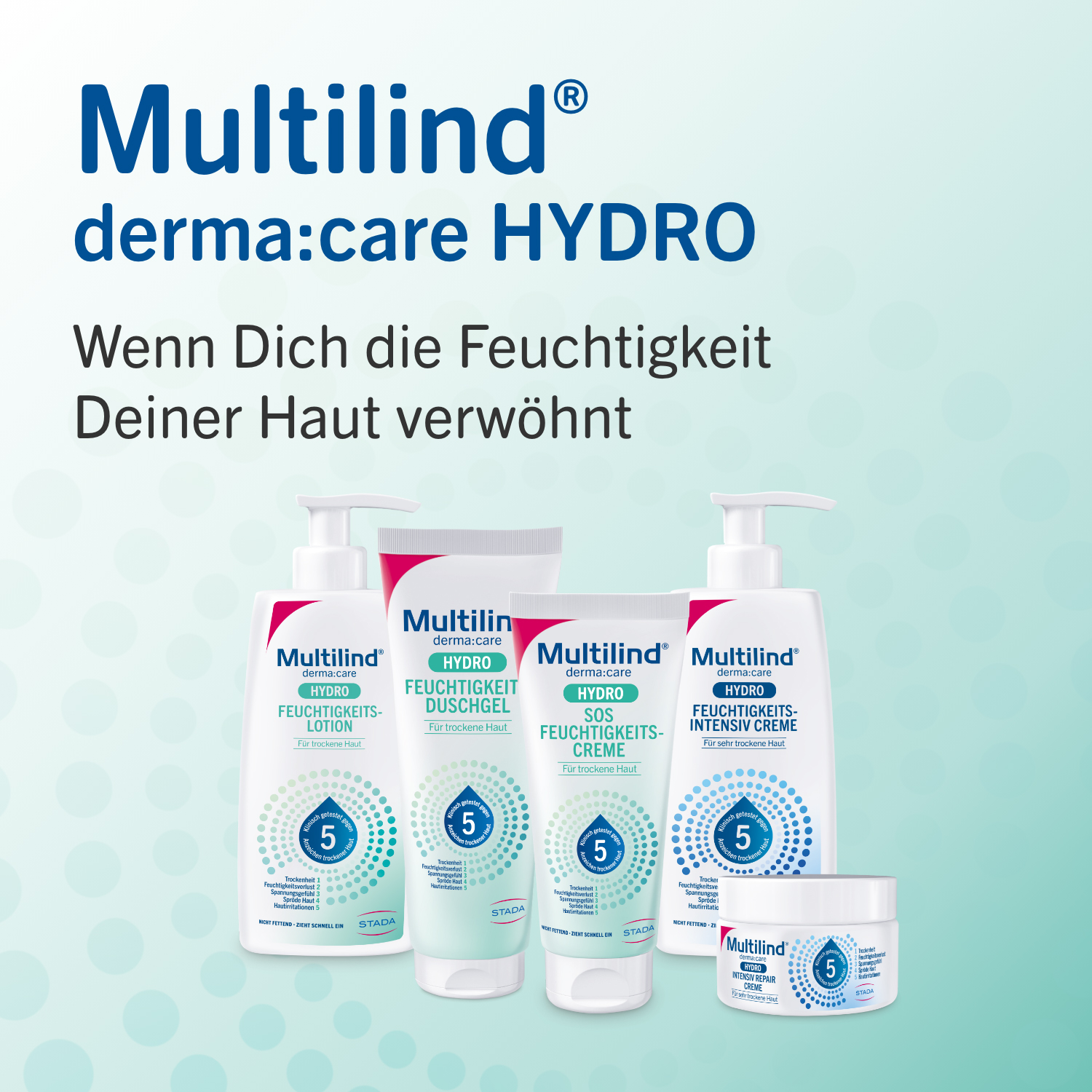 MULTILIND® DERMA:CARE HYDRO FEUCHTIGKEITS-DUSCHGEL: KLINISCH GESTESTET GEGEN 5 ANZEICHEN TROCKENER HAUT Multilind® derma:care HYDRO Feuchtigkeits-Duschgel sorgt für sanfte Reinigung und Beruhigung bei der täglichen Pflege trockener Haut. 1. Trockenheit 2. Feuchtigkeitsverlust 3. Spannungsgefühl 4. Spröde Haut 5. Hautirritationen Die Hautpflegeserie Multilind® derma:care HYDRO wurde speziell entwickelt, um die 5 häufigsten Anzeichen trockener Haut zu bekämpfen sowie die Beschaffenheit und das Hautgefühl zu verbessern. Sie dient zur täglichen Pflege trockener und sehr trockener Haut sowie zur Spezialpflege besonders trockener und rauer Hautareale. Alle Produkte ziehen schnell ein, fetten nicht und sind für empfindliche Haut geeignet