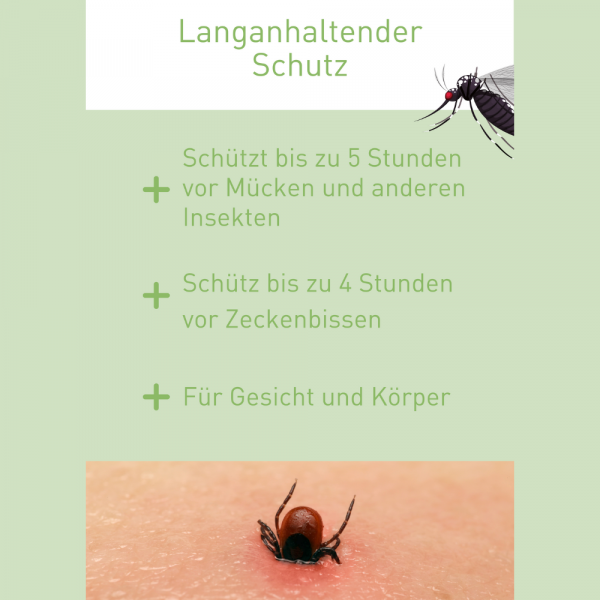 - Schützt bis zu 5 Stunden vor Mückenstichen und anderen Insektenstichen