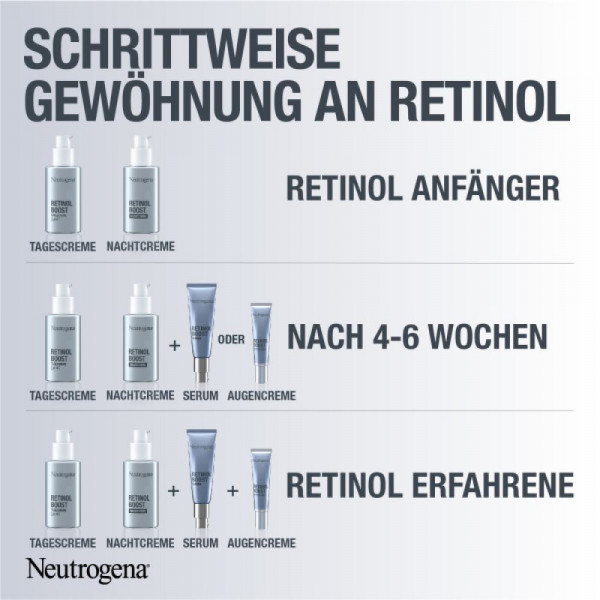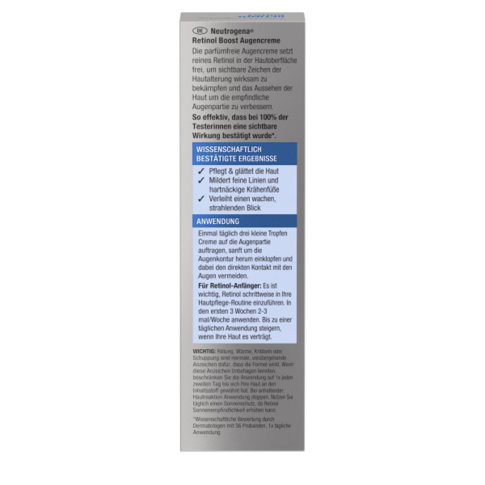 - Die parfümfreie Neutrogena Retinol Boost Augencreme bekämpft sichtbare Zeichen der Hautalterung: feine Linien, Krähenfüße und eine müde aussehende Augenpartie. Spendet Feuchtigkeit. Für jünger und gesund aussehende Haut