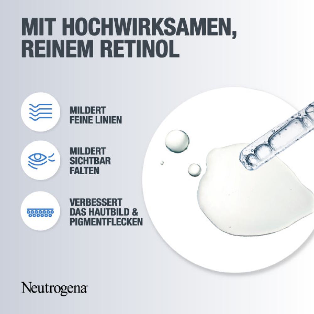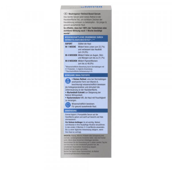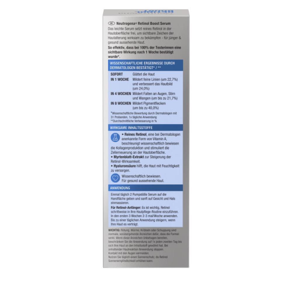 - Das hoch wirksame Neutrogena Retinol Boost Serum bekämpft sichtbare Zeichen der Hautalterung: Falten, verringerte Straffheit, müde Haut, Trockenheit und Pigmentflecken. Für jünger und gesund aussehende Haut
