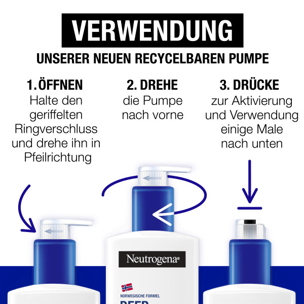 • Die nicht fettende Hautpflege Lotion hat eine recycelbare Pumpe und Flasche**, zusätzlich ermöglicht der praktische Pumpspender eine exakte Dosierung. (**wo Recyclingmöglichkeiten vorhanden sind)