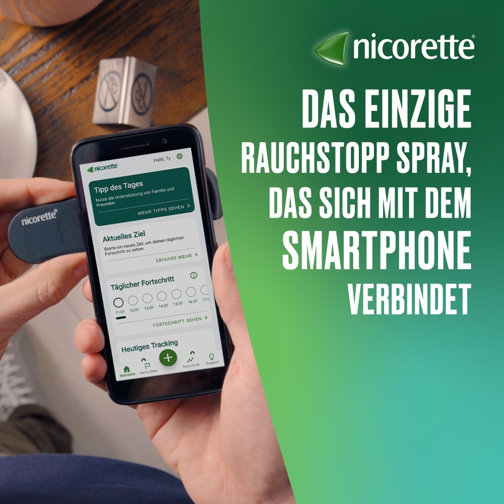 • nicorette® Spray – jetzt mit Tracking-App „nicorette®  Nichtraucher“ verbinden: trackt die Nutzung des Sprays und damit das Erreichen der selbst gesetzten Rauchstopp-Ziele