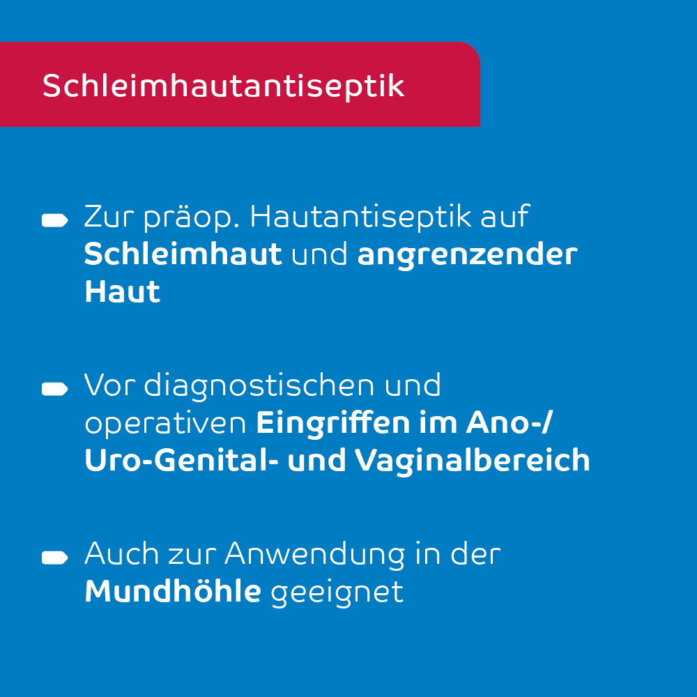 - Das Präparat ist ein Antiseptikum zur wiederholten, zeitlich begrenzten antiseptischen Behandlung von Schleimhaut und angrenzender Haut vor diagnostischen und operativen Maßnahmen - im Ano-Genitalbereich von Vagina, Vulva, Glans penis, auch vor Katheterisierung der Harnblase - in der Mundhöhle.