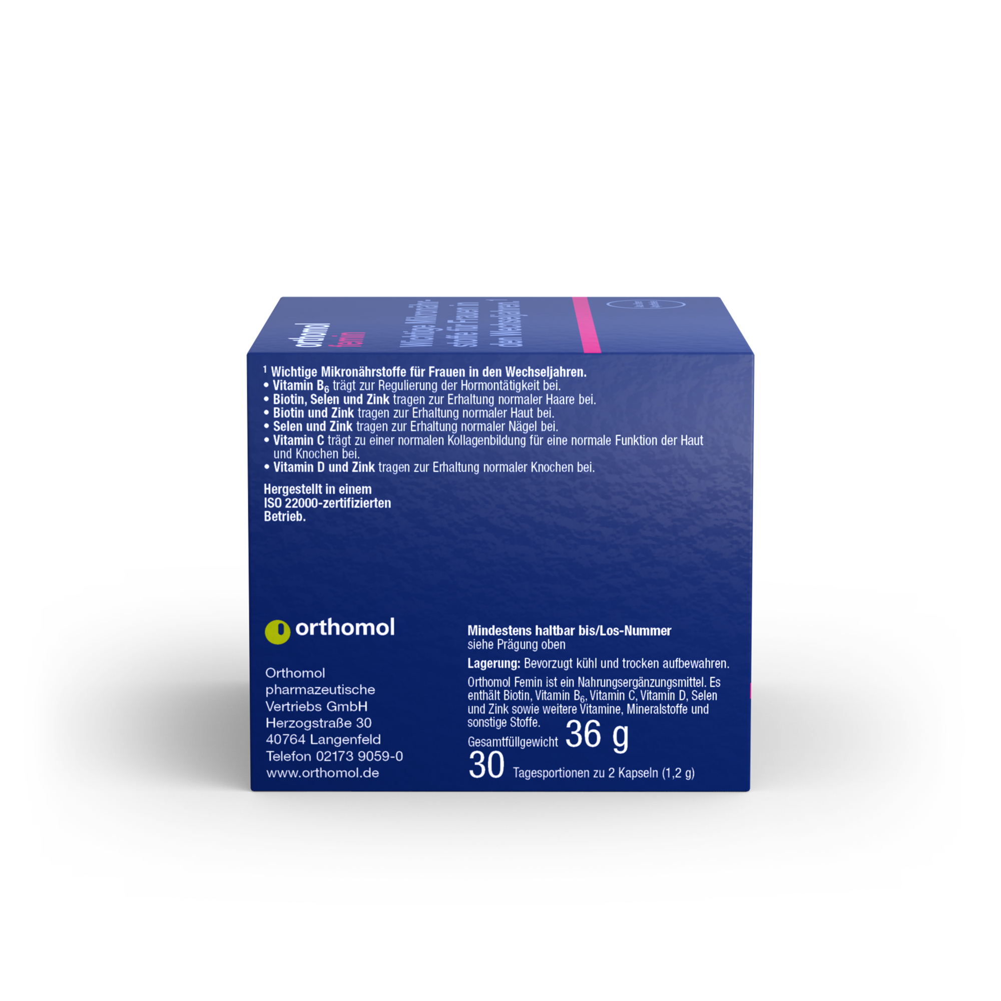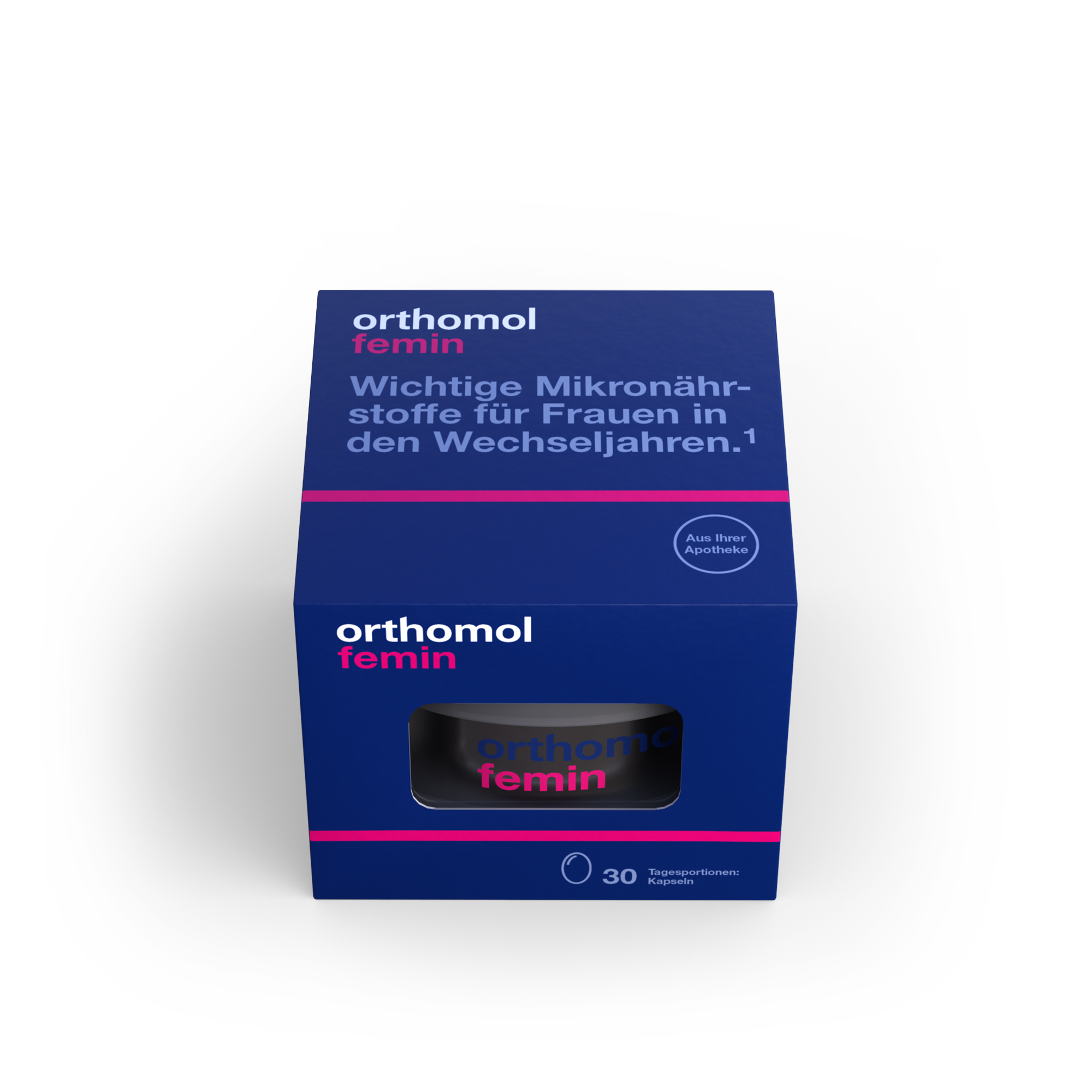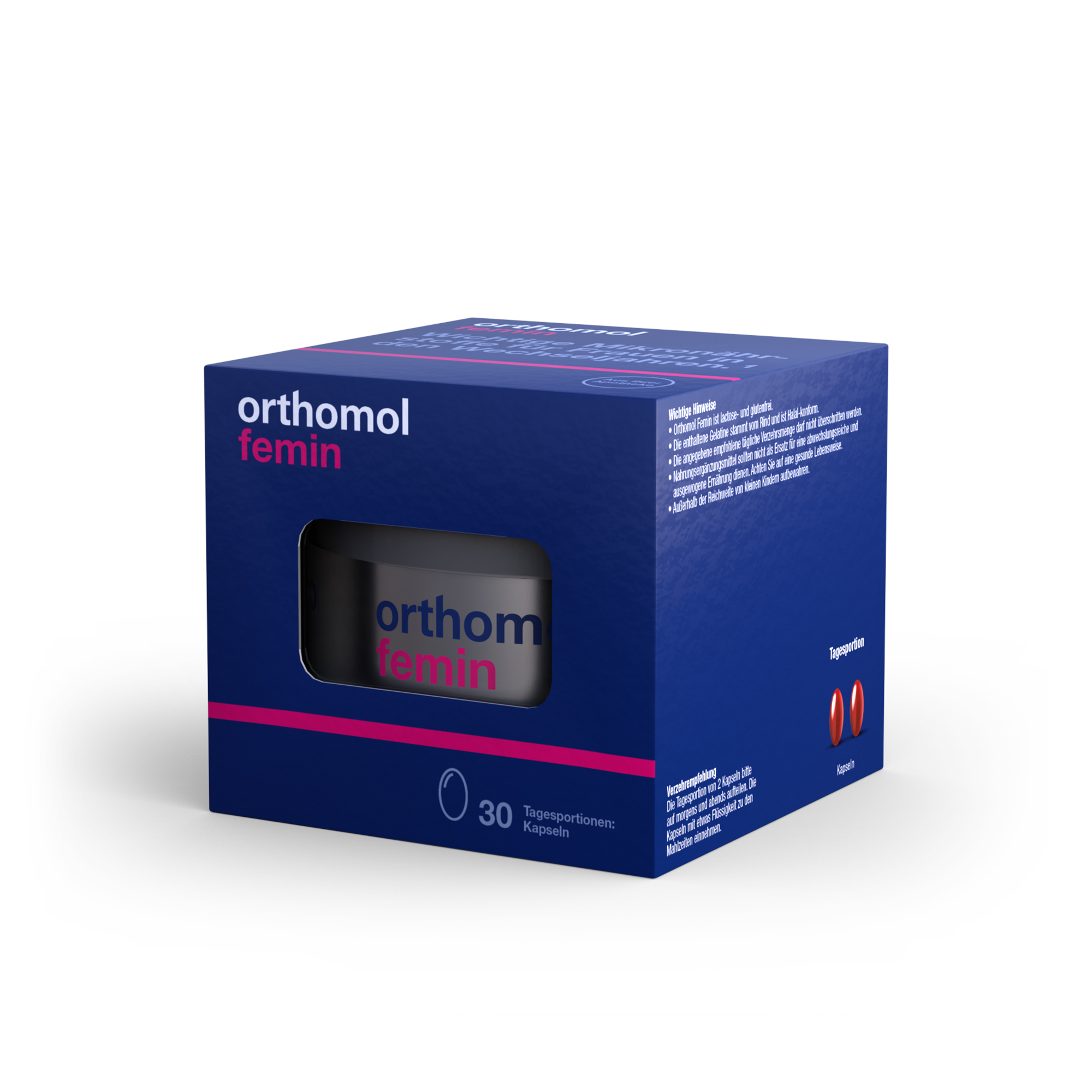 Orthomol Femin ist ein Nahrungsergänzungsmittel für Frauen in den Wechseljahren. Wichtige Nährstoffe für Haut, Haare und Nägel. Mit Biotin zum Erhalt normaler Haut und Haare sowie Selen zum Erhalt normaler Nägel. Mit Isoflavonen aus Soja und Lignanen aus Leinsamen, wichtigen Fettsäuren und Coenzym Q10.