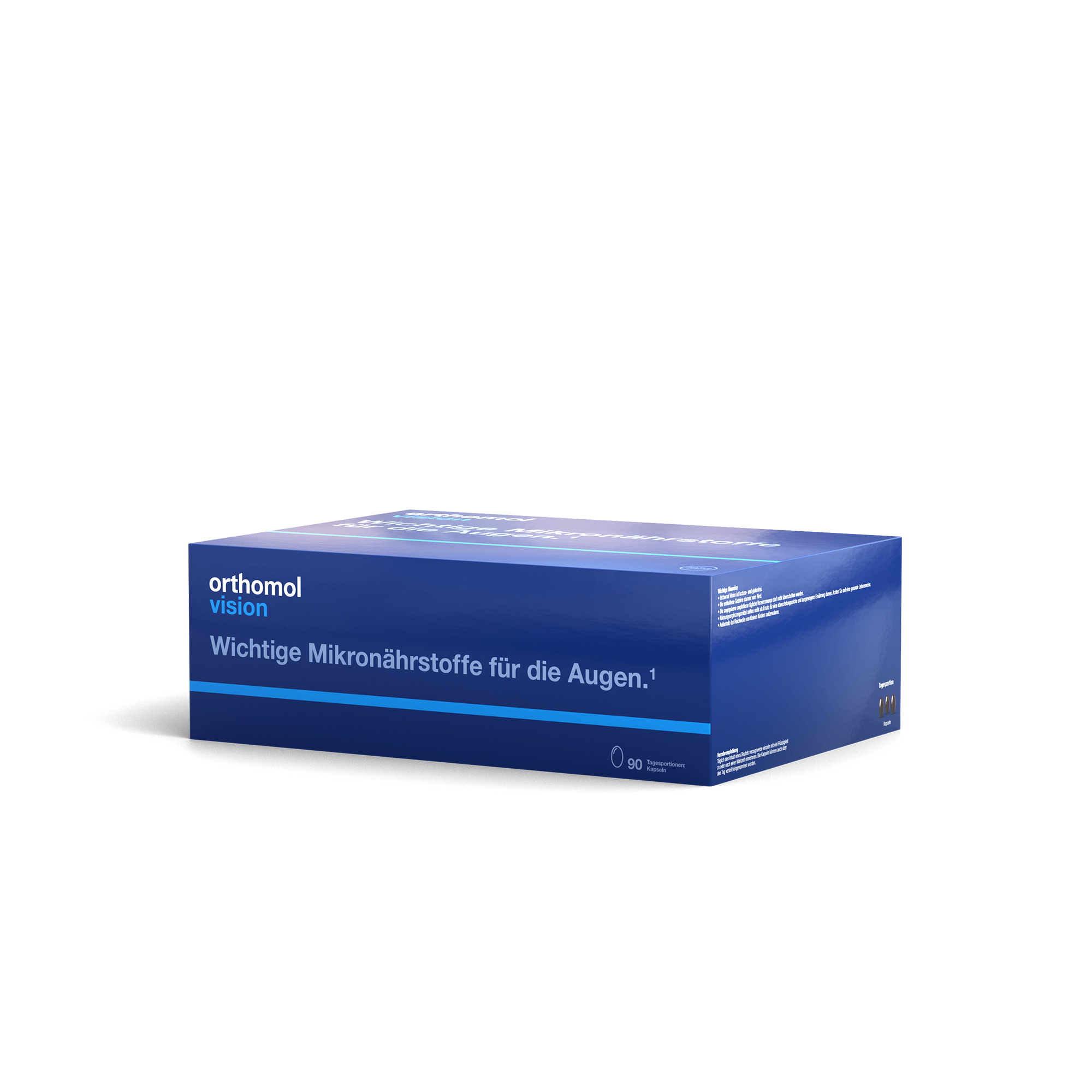 Orthomol Vision ist ein Nahrungsergänzungsmittel. Wichtige Mikronährstoffe für die Augen. Mit Vitamin A, Vitamin B2 (Riboflavin), Zink und der Omega-3-Fettsäure DHA zur Aufrechterhaltung der normalen Sehkraft. Mit Lutein und Zeaxanthin.