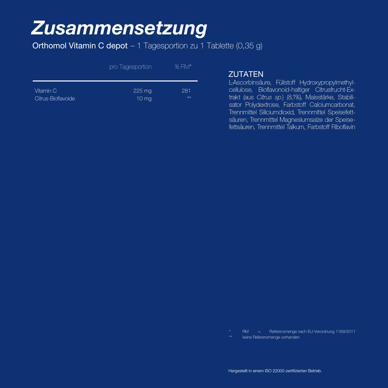 L-Ascorbinsäure, Füllstoff Hydroxypropylmethylcellulose, Bioflavonoid-haltiger Citrusfrüchte-Extrakt (aus Citrus sp.) (8,2 %), Maisstärke, Trennmittel Siliciumdioxid, Trennmittel Speisefettsäuren, Stabilisator Polydextrose, Farbstoff Titandioxid, Trennmittel Magnesiumsalze der Speisefettsäuren, Trennmittel Talkum, Farbstoff Riboflavin.