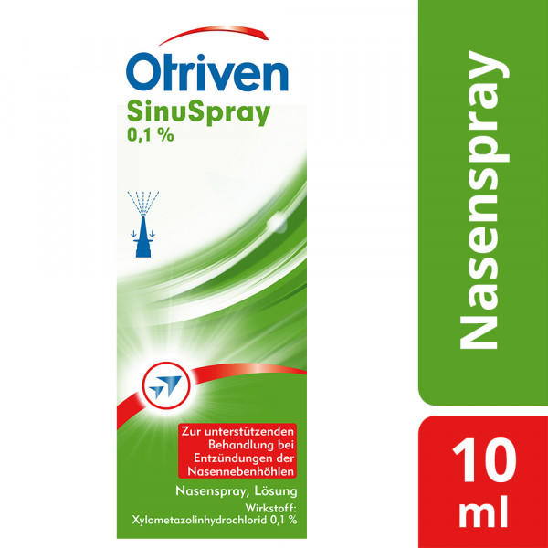 Otriven SinuSpray 0,1 % hat sich zur unterstützenden Behandlungbei Entzündungen der Nasennebenhöhlen (Sinusitis) bewährt. , Der Wirkstoff Xylometazolin sorgt dafür, dass die Nasenschleimhaut schnell abschwillt. Auf diese Weise wird auch der Abfluss von Sekreten erleichtert. Das besondere Plus:Der Aromastoff Menthol wird als angenehm kühlend empfunden und verstärkt das Gefühl, besser durchatmen zu können.Otriven