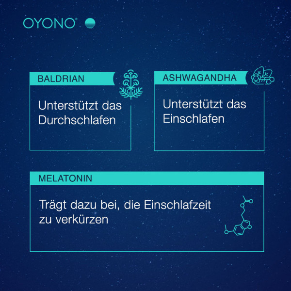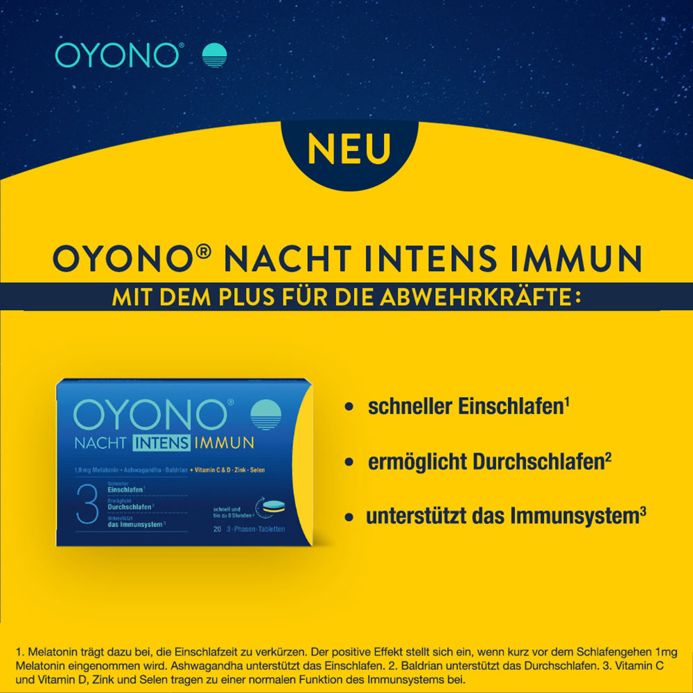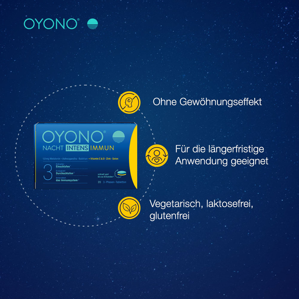 OYONO® NACHT INTENS IMMUN kombiniert 1,9 mg Melatonin und schlaffördernde Pflanzenextrakte aus Baldrian und Ashwagandha mit den immununterstützenden Inhaltsstoffen Vitamin C, Vitamin D, Zink und Selen. Dabei greift OYONO® NACHT INTENS IMMUN auf die bereits bewährte 3-Phasen-Technologie von OYONO® zurück. Das Besondere ist, dass die enthaltenen Inhaltstoffe nach Einnahme der Tablette nicht gleichzeitig, sondern zeitlich versetzt während der Nacht freigesetzt werden.