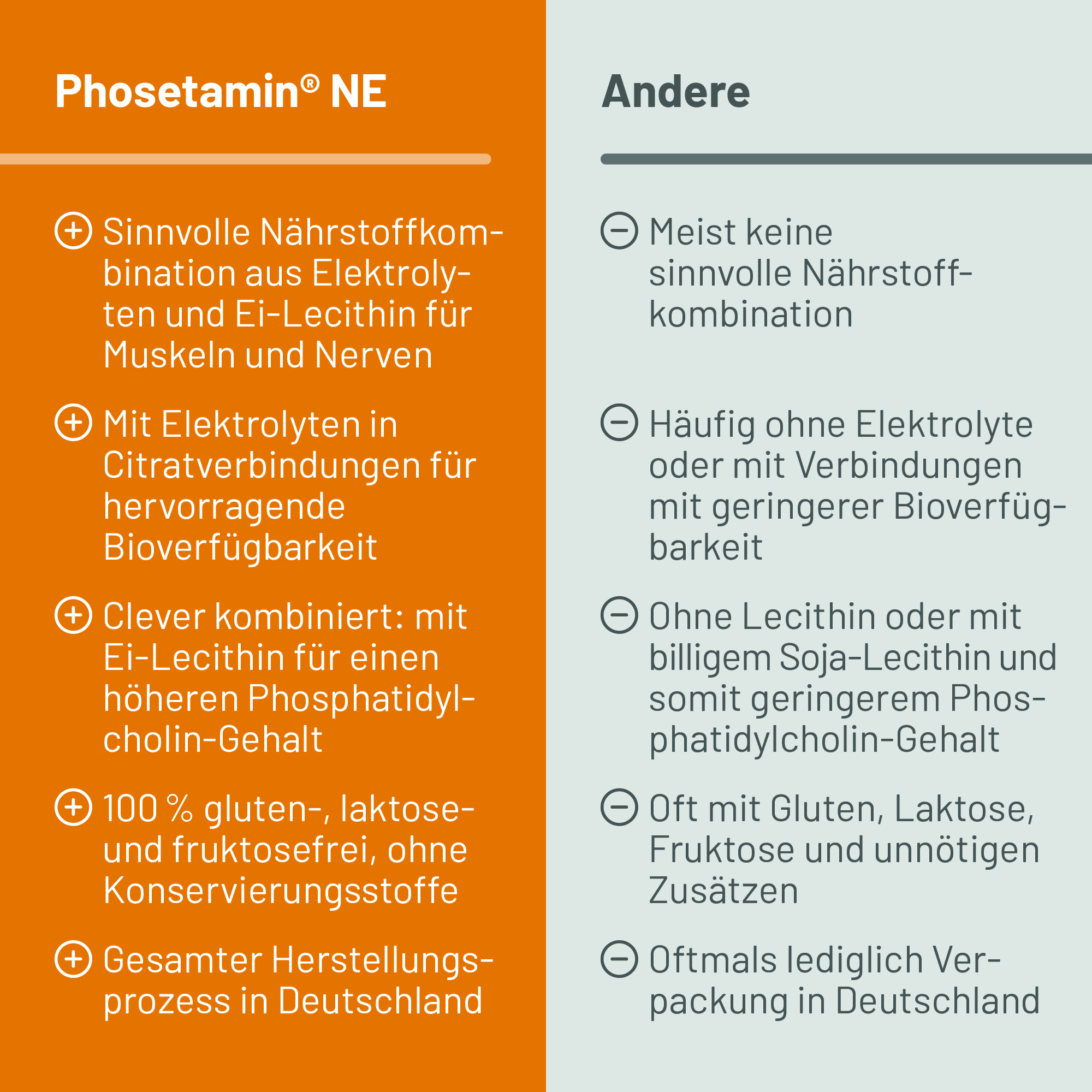 Die Inhaltsstoffe von Phosetamin NE, der speziellen Kombination aus Elektrolyten und Ei-Lecithin, leisten einen effektiven und wertvollen Beitrag zur Gesundheit der Nerven und zu einer gesunden Muskelfunktion.