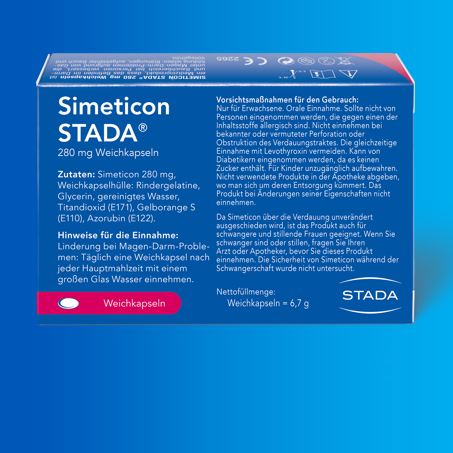 Es kommt vor, dass im Darm entstehende Gase in kleinen Schaumblasen gefangen werden. Diese Schaumbildung im Verdauungstrakt kann das Entweichen im Darm entstehender Gase erschweren oder sogar verhindern, was sich durch Blähungen, unangenehme gasbedingte Bauchkrämpfe, das Gefühl eines aufgeblähten Bauchs und ein unangenehmes Völlegefühl äußern kann. Simeticon STADA® ist mit 280 mg ein hoch dosierter Entschäumer und sorgt schnell für Linderung.