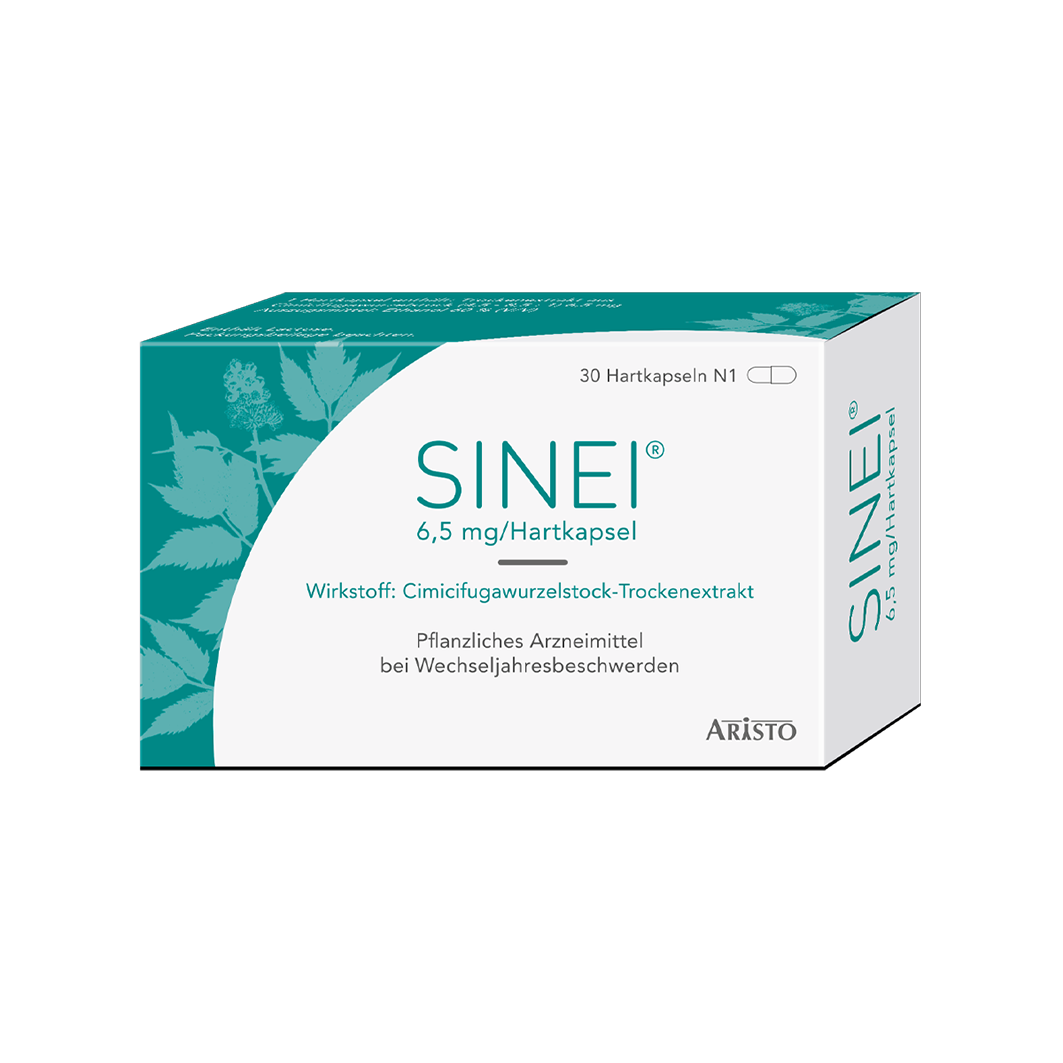 Sinei 6,5 mg/Hartkapsel. Wirkstoff: Cimicifugawurzelstock-Trockenextrakt. Anwendungsgebiete: zur Besserung von psychischen und neurovegetativen Beschwerden, bedingt durch die Wechseljahre.